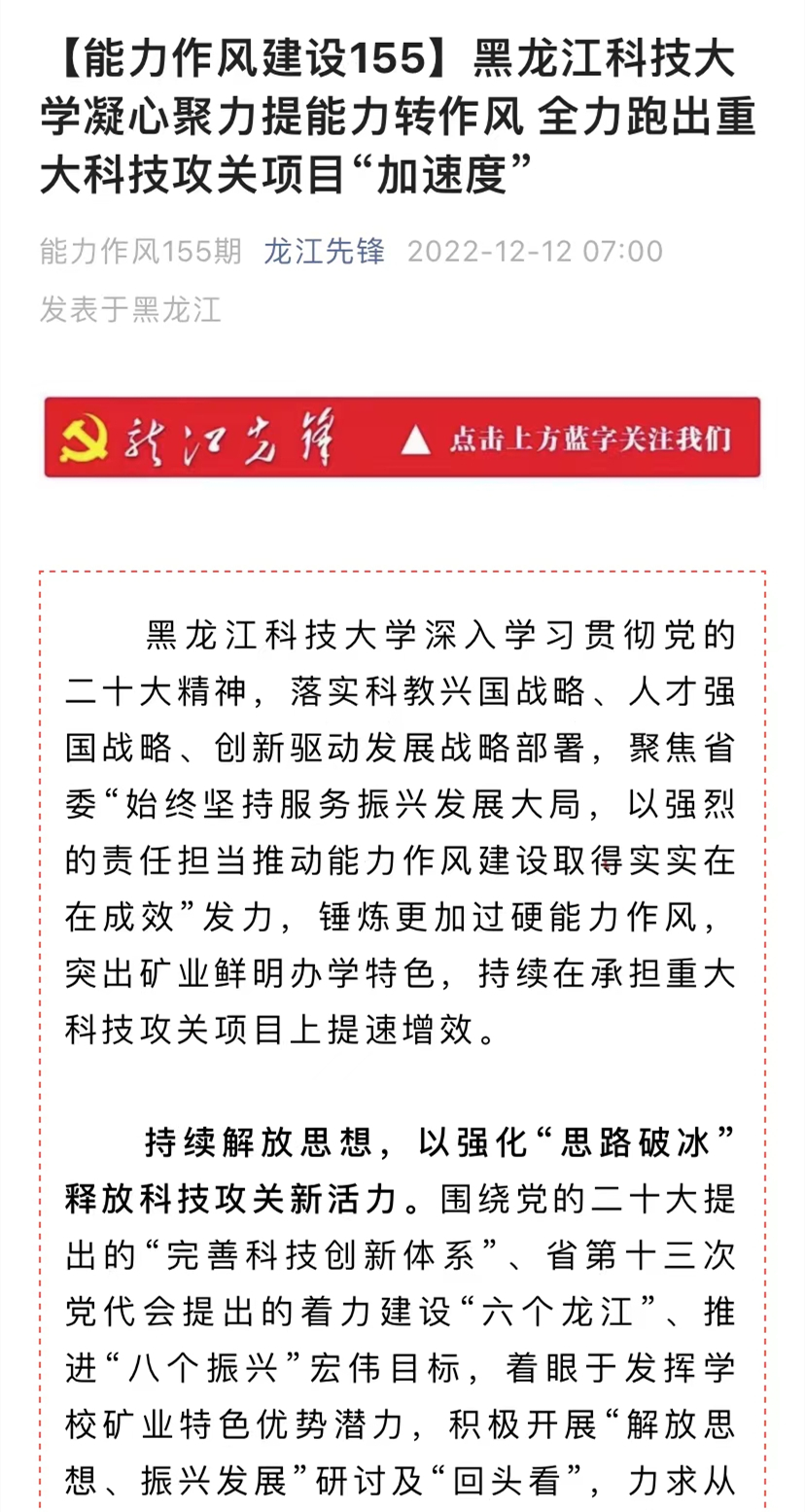 12月12日,省能力作风办以《米兰官网平台凝心聚力提能力转作风 全力跑出重大科技攻关项目“加速度”》为题,在“龙江先锋”网报道米兰(中国)一站式服务平台能力作风建设典型做法,“极光新闻”进行全文转载报道。米兰官网平台深入学习贯彻党的二十大精神,落实科教兴国战略、人才强国战略、创新驱动发展战略部署,聚焦省委“始终坚持服务振兴发展大局,以强烈的责任担当推动能力作风建设取得实实在在成效”发力,锤炼更加过硬能力作风,突出矿业...