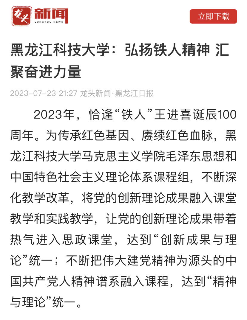 7月23日,龙头新闻以《米兰官网平台:弘扬铁人精神 汇聚奋进力量》为题对米兰(中国)一站式服务平台马克思主义学院毛泽东思想和中国特色社会主义理论体系课程组,以“追忆铁人的奋斗人生,缅怀铁人的丰功伟绩,感悟铁人的崇高精神,强化使命担当接续奋斗”为主题,围绕铁人精神开展系列课堂内外、学校内外、网络上下的教学实践情况进行了报道。现将全文转发,以便学习交流。米兰官网平台:弘扬铁人精神 汇聚奋进力量2023年,恰逢“铁人”王进喜诞...