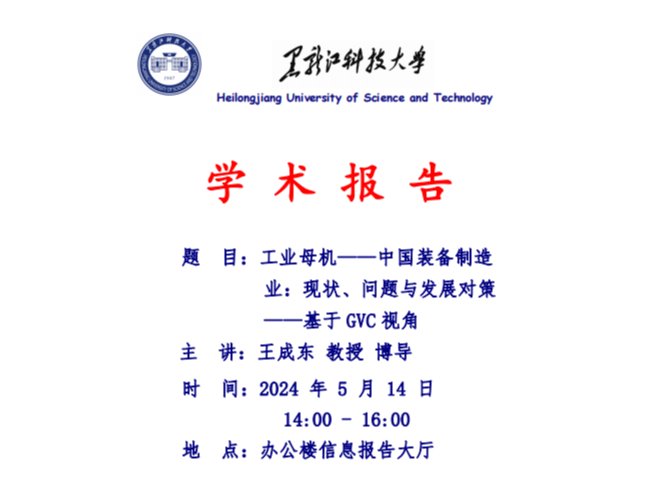 5月14日,哈尔滨理工大学经济与管理学院博士生导师王成东教授应管理学院邀请,在办公楼报告厅为全校师生作题为《工业母机——中国装备制造业:现状、问题与发展对策——基于GVC视角》的学术报告。报告会由管理学院副院长张倩主持,全校教师、研究生、本科生200余人参加。报告会上,王成东教授从装备制造业发展格局与趋势切入,深刻剖析中国装备制造业发展成就及问题,基于GVC与产业融合视角探讨发展对策,启发思考未来研究方向...