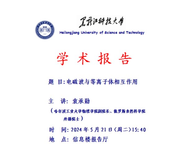 5月21日,哈尔滨工业大学物理学院副院长、俄罗斯自然科学院外籍院士、黑龙江省物理学会副理事长兼秘书长袁承勋教授应邀在信息楼报告厅,为全校师生作题为《电磁波与等离子体相互作用》的学术报告。报告会由科技处副处长王涛主持,理学院领导、教师及全校相关专业教师、研究生及本科生共200多人参加了本次学术报告会。报告会上,袁承勋教授与师生亲切互动交流学术问题,从学科介绍到研究背景,再到电磁波在等离子体中传输的基本...