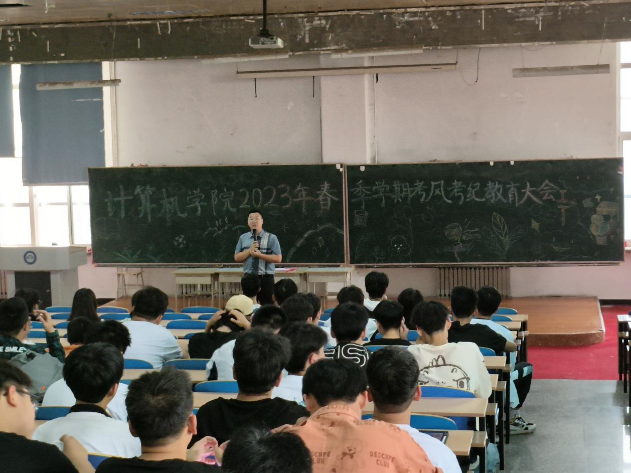 02/ 2023-06计算机学院组织召开2023年春季学期考风考纪教育大会5月31日,计算机学院在主楼WN0401组织召开了2023年春季学期考风考纪教育大会,学院2022级全体学生参会,辅导员王飞老师主持会议。会上,王飞围绕学生的期末考试复习准备、考试心态、考风考纪的严肃性和重要性、考试作弊违纪处分教育以及考试作弊的危害等方面进行展开。一是鼓励同学们全面、认真地开展复习,诚实、冷静地迎接期末考试,树立优良学风、实现零作弊。二是把严肃考风考纪的目的与意义传达给每一位同学,使同学们从思...