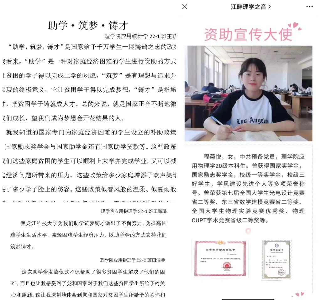 02/ 2023-06理学院开展“以诚为名,凭信而立”诚信教育主题活动为了强化资助育人成效,加强对学生的诚信、感恩、励志和成才教育,根据学校《关于开展学生资助诚信教育主题活动的通知》精神,结合理学院学生工作特点,开展形式多样、内容充实的诚信教育主题活动。开展助学征文,树立诚信典型。为进一步扩大资助成效,激励广大受助学生奋发自强、立志成长、感恩奉献,学院组织开展以“助学筑梦铸才”为主题的征文活动。受助学生结合自身经历与感悟,以文字形式讲述个人励志成长故事,还评选出...