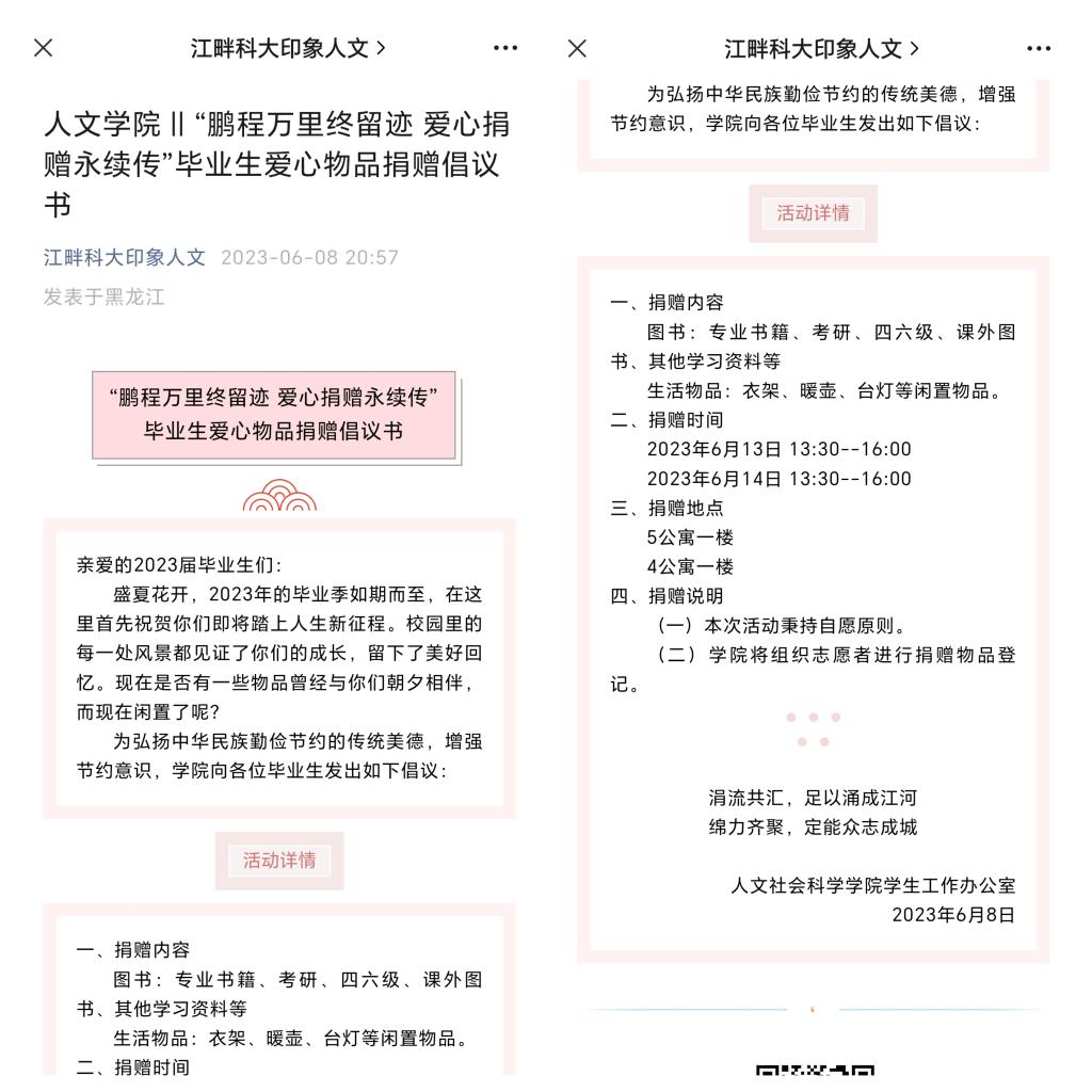13/ 2023-06人文学院开展“季忆留夏 青春远航”2023届毕业生文明离校教育活动为营造文明有序、温馨难忘的离校氛围,做好2023届毕业生文明离校教育工作,人文学院精心组织开展了“季忆留夏 青春远航”毕业生文明离校教育活动。氤氲书香,情留米兰官网平台满园。发布“鹏程万里终留迹 爱心捐赠永续传”毕业生爱心物品捐赠倡议书,号召毕业生将闲置的图书、生活物品等进行捐赠,弘扬中华民族勤俭节约的传统美德,传递爱心,续写青春故事。不负韶华,绽放青春色彩。开展“星梦研续共向未来”考研经验分享,“砥志研思 ...
