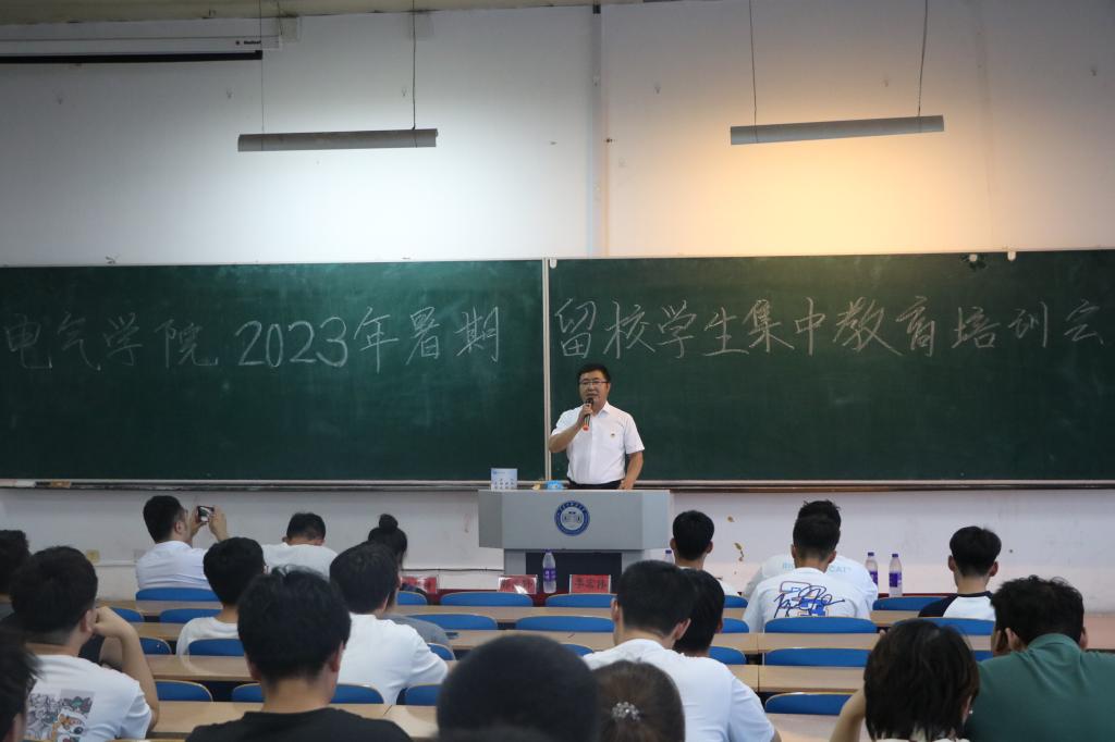 03/ 2023-07电气学院召开2023年暑期留校学生集中教育培训会6月30日下午,电气学院在主楼WS0303召开2023年暑期留校学生集中教育培训会,学院全体辅导员与226名暑期留校学生参加会议,会议由负责教育工作辅导员赵国旭主持。本次会议从暑期留校安全、留校日常管理、校内服务保障三个方面对留校学生进行培训。辅导员李宏伟宣布了2023年暑期留校学生分班情况,班级负责人、班主任配备、辅导员老师值班等情况,告知学生暑假期间学校各公共场所时间调整情况。辅导员陈慧琦领学并组织签署了《暑...