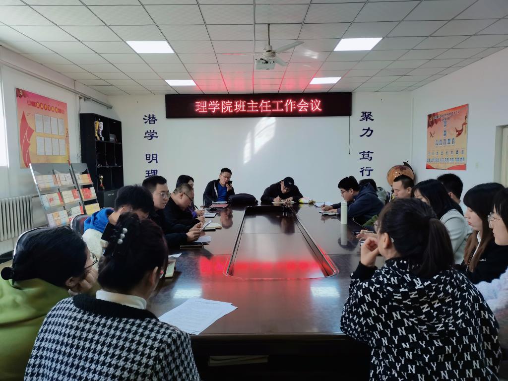 20/ 2023-10理学院召开班主任工作会议为加强班主任队伍建设,全面提升班主任管理水平与业务素养,使班主任进一步明确工作任务和职责,充分发挥班主任在学校教育和管理工作中的重要作用,10月16日中午,学院召开2023年秋季学期班主任工作会议,学院全体辅导员以及各年级班主任参加此次会议,会议由学工办主任赵永明主持。会上,辅导员李威燃对开学以来学生教育管理等工作进行总结。辅导员刘鑫鹏向所有班主任讲解了助学金评定相关细则和注意事项。各年级班主任围绕“...
