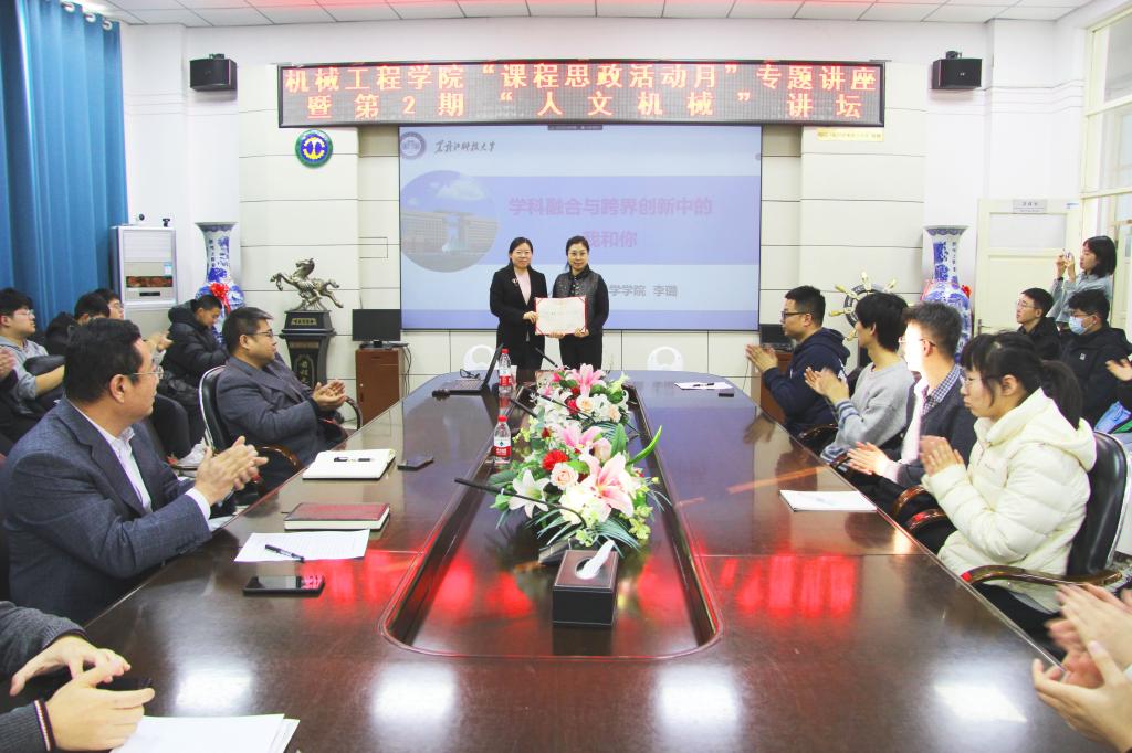 08/ 2023-12机械工程学院举办“课程思政活动月”专题讲座暨第2期“人文机械”讲坛12月7日下午,机械工程学院在学院二楼会议室举办“课程思政活动月”专题讲座暨第2期“人文机械”讲坛。邀请全省优秀教师、全省师德先进个人、省一流本科课程负责人、人文社会科学学院汉语言文学系主任李璐主讲。学院班子成员、部分教师和学生通过线上线下结合方式聆听了讲座。讲座伊始,由学院院长唐庆菊为李璐老师颁发了“人文机械”讲坛特聘专家聘书;之后李璐老师以“学科融合与跨界创新中的我和你”为题,从人类探索太空的...