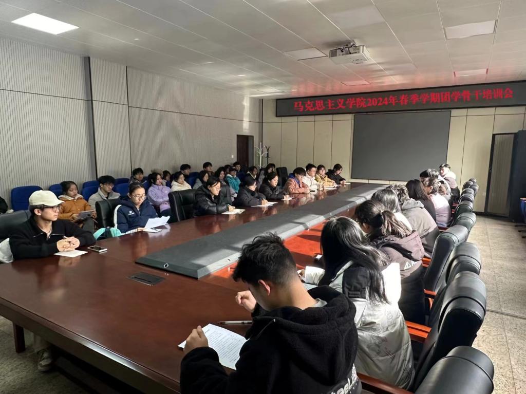 28/ 2024-02马克思主义学院召开2024年春季学期团学骨干培训会为提高学院团学骨干队伍的整体素质,进一步提高学生干部综合素养和工作能力,增强服务意识和创新意识,确保新学期各项学生工作顺利开展,2月27日,马克思主义学院召开2024年春季学期团学骨干培训会。会上,各团学组织主席团成员进行了工作述职。随后,辅导员宋烨对2023年学生工作进行总结,并围绕思想引领、学风建设、科技创新、校园文化活动、学生日常管理等方面做新学期工作部署。最后,副处级辅导员赵红对团学骨干提出三点希...