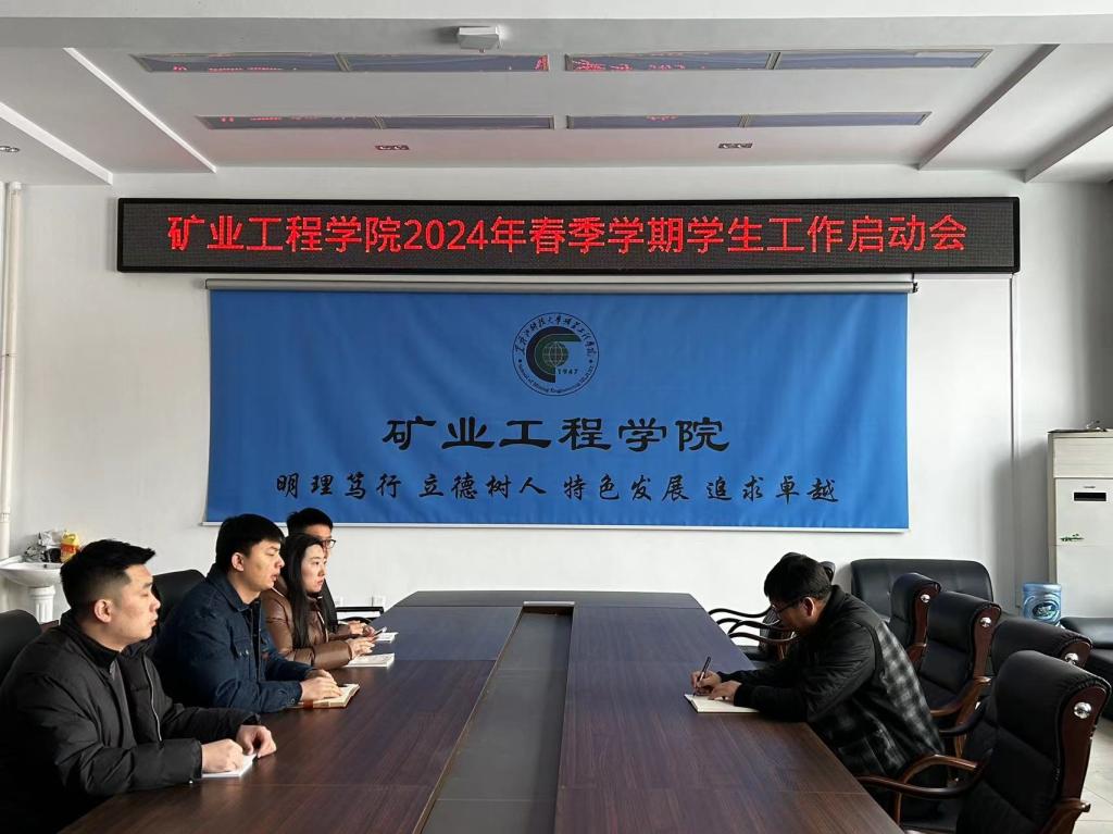 28/ 2024-02矿业工程学院学子以饱满的热情投入新学期学习生活为全面落实学校党委对学生工作提出的要求,将“立德树人”贯穿于学生成长成才全过程。矿业工程学院按照2024年春季学期学生工作会议相关要求,切实做好学生返校和开学启动工作。2月22日上午,矿业工程学院召开2024年春季学期学生工作启动大会。学院全体辅导员参加会议,会议由学院党委书记刘海涛主持。会上,刘海涛传达了学校2024年春季学期学生工作会议精神,安排布置了新学期开学启动相关工作,各辅导员围绕负责工作汇报了本学...