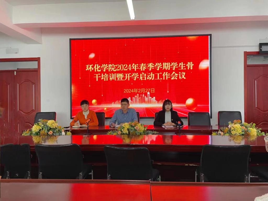 28/ 2024-02环化学院召开2024年春季学期学生骨干培训暨开学学生工作启动会议2月27日中午,环化学院在学院四楼报告厅召开2024年春季学期学生骨干培训暨开学学生工作启动会议,学院副处级辅导员周惠玉、学工办主任陈汝楠,学院团学组织学生骨干60余人参加会议,会议由团委书记朱海璐主持。会上,朱海璐安排部署了新学期共青团相关工作,并从思想状态、言行举止、工作态度、能力作风和责任担当五个方面对广大学生干部提出了要求,希望广大学生干部在工作中要高标准、严要求,不断提高服务师生能力。学工办主...