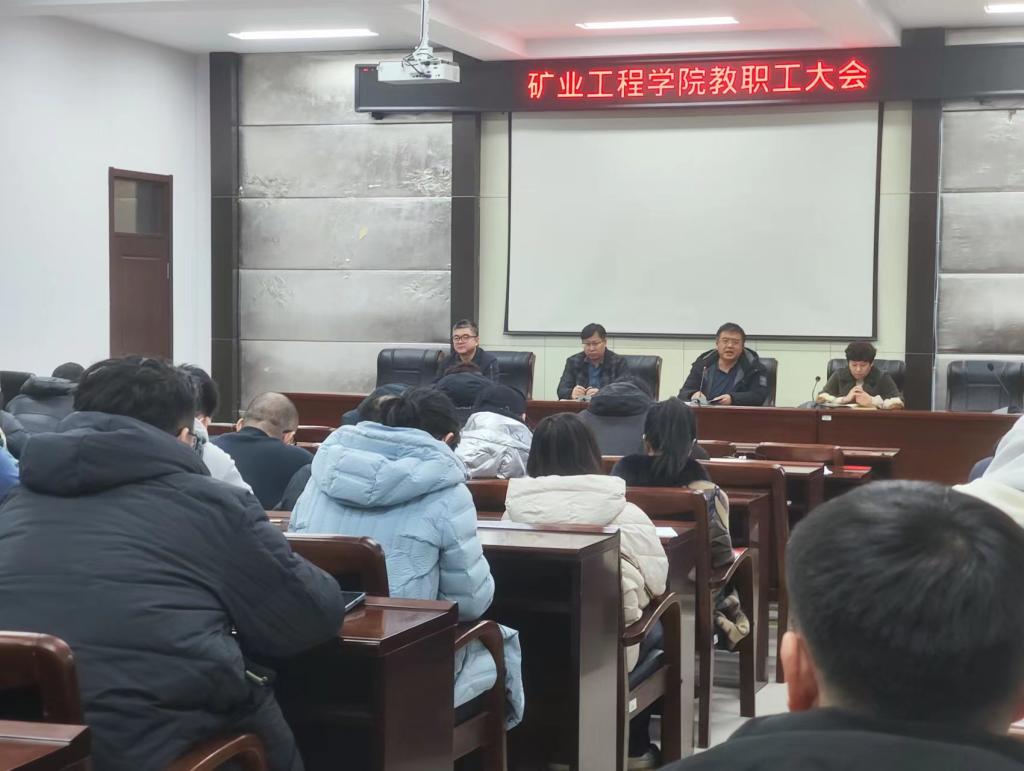 27/ 2024-02矿业工程学院召开教职工大会部署2024年度重点工作功崇惟志,业广惟勤。2月23日,矿业工程学院召开2024年度新学期教职工大会,会议由学院党委书记刘海涛主持,学院全体教师参加会议。会上,副院长康华围绕如何上好开学第一课、如何做好本科教学基础工作、如何做好迎接审核评估等重点工作进行了安排部署;副院长商宇航就学科建设、研究生教育和科研工作做了安排部署。院长肖福坤简要回顾了学院过去一年在人才培养、科学研究、社会服务、师资队伍建设等方面取得的主要成绩,汇报了...