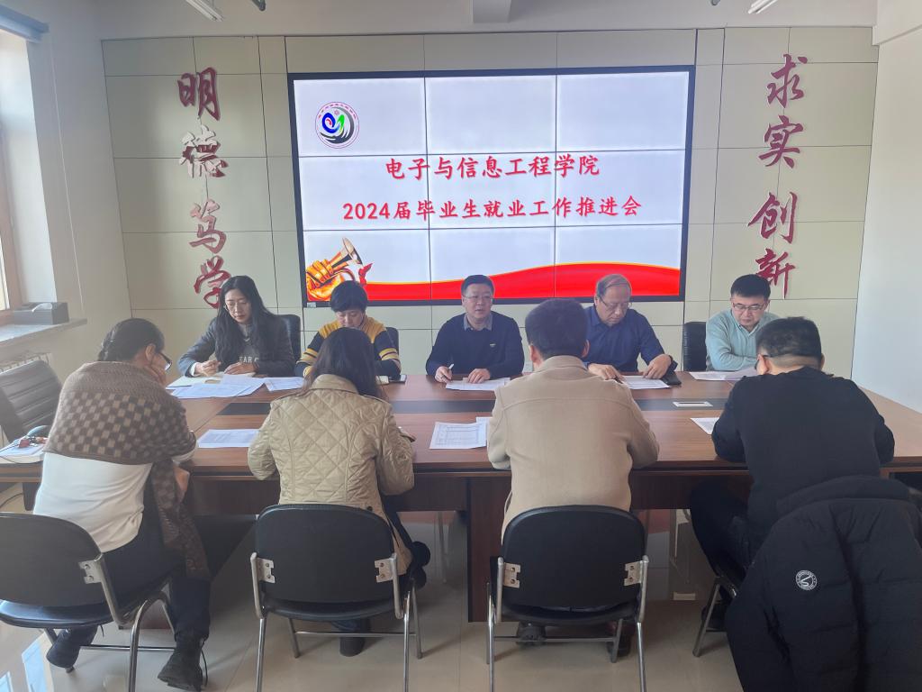 11/ 2024-03电子与信息工程学院召开2024届毕业生就业工作推进会3月8日,电信学院在朝阳楼0809召开2024届毕业生就业工作推进会。学院领导班子成员、各系主任、就业辅导员参加会议。会议由党委副书记吕平主持。会上,副处级辅导员高宇通报了当前阶段各专业、各班级毕业生就业工作进展及签约情况。电子信息工程教研室主任赵秋多、电子信息科学与技术教研室主任马仲甜、通信工程教研室主任张洪全分别就各自专业学生目前就业进展情况以及下一步具体工作进行汇报。学院党委副书记吕平就学院专场招聘...