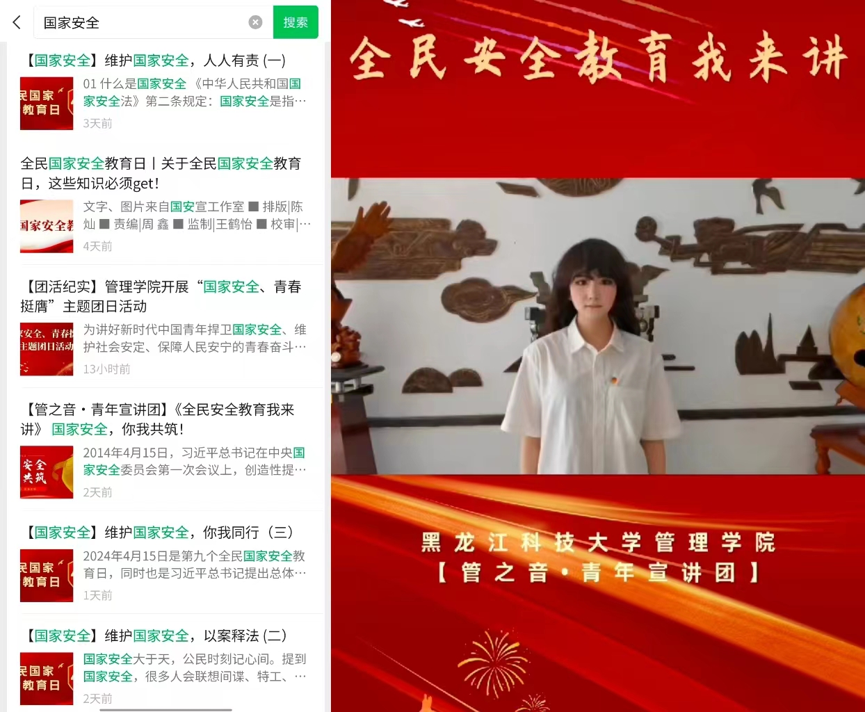 17/ 2024-04管理学院多角度全方位开展“国家安全教育日”系列活动为学习贯彻习近平总书记关于坚持“总体国家安全观创新引领10周年”的重要论述,结合学生处“永葆赤心 立德践行 勤学善思 笃行担当”主题思想教育方案要求,引导我院青年学生增强国家安全意识,筑牢国家安全防线,自觉维护国家安全,准确把握党和国家面临的风险挑战,坚决与危害国家安全的行为作斗争,管理学院多角度全方位开展“全民国家安全教育日”系列活动。落实安全教育,共筑青春防线。为深入贯彻落实党的二十大关于维护国...