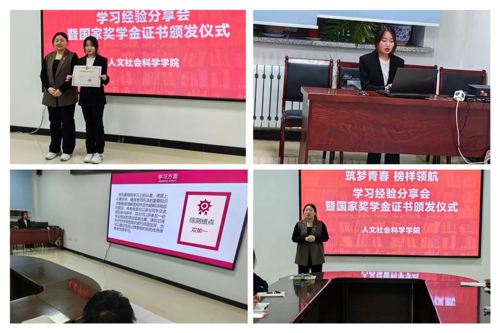 19/ 2024-04人文学院召开“筑梦青春 榜样领航”学习经验分享会暨国家奖学金证书颁发仪式为深入贯彻落实米兰(中国)一站式服务平台“永葆赤心 立德践行 勤学善思 笃行担当”主题思想教育相关要求,充分发挥榜样示范引领作用,营造积极向上的学习氛围,人文学院于4月18日在朝阳楼0317室召开了“筑梦青春 榜样领航”学习经验分享会暨国家奖学金证书颁发仪式。会上,辅导员巩冬阳为国家奖学金获得者社会工作22-1班张恩熙颁发国家奖学金证书,并对其在学习态度、党团活动、学科竞赛、社会实践等方面取得的成绩表示肯定,勉励她在未来的学习和工...