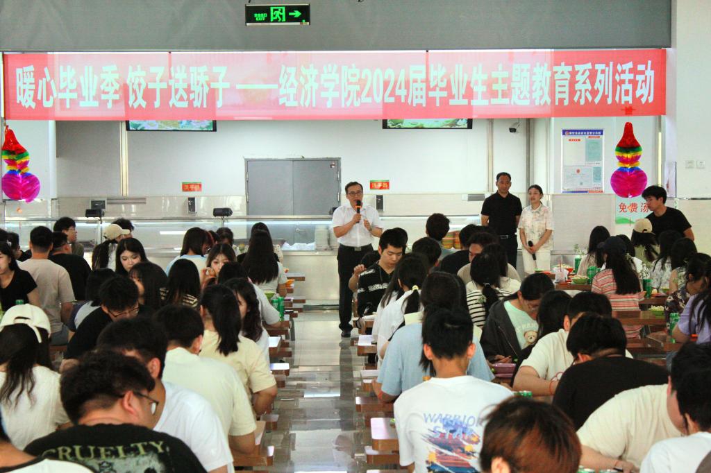 11/ 2024-06经济学院开展“暖心毕业季 饺子送骄子”——2024届毕业生主题教育活动又是一年毕业季,中国有这样的传统,父母喜欢在孩子临出门之前将声声叮咛与谆谆教诲包在一枚枚小小的饺子里,期许孩子出门在外能顺利安康。6月10日恰逢端午佳节,沁香园二楼暖意融融,情意浓浓。经济学院组织开展“暖心毕业季饺子送骄子”——为毕业生送一份饺子活动,为2024届毕业生送行,祝福所有的学生离“家”在外时顺利安康,前程似锦。学院精心布置了“饺子宴”现场,院长孙永波、党委副书记邬丽群以及毕业班班主任为毕业...
