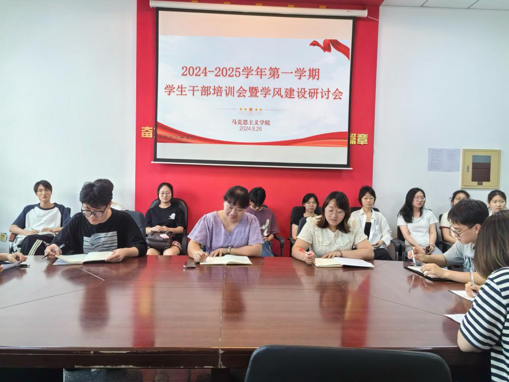 28/ 2024-08马克思主义学院召开2024年秋季学期学生干部培训暨学风建设研讨会结合《关于做好2024年秋季学期学生返校和开学启动工作的安排》及《2024-2025学年第一学期学生首周教育活动指导方案》相关要求,为提高学院学生干部队伍的综合素养和工作能力,充分发挥学生干部的桥梁纽带和示范作用。8月26日,马克思主义学院召开2024年秋季学期学生干部培训暨学风建设研讨会,团学组织骨干、各班级班干参加会议,会议由副处级辅导员赵红主持。会议伊始,宋烨围绕共青团工作、学风建设、首周教育、学生日常管理等...