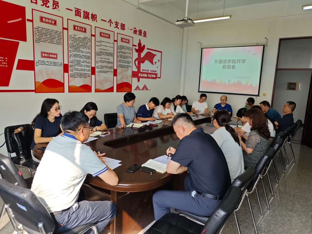 29/ 2024-08外国语学院2024年秋季学期各项工作全面启动8月16日,外国语学院组织召开2024年秋季学期开学工作启动会。会上副院长程雪连对假期审核评估工作完成情况进行全面总结,指出了目前存在的问题,对审核评估、开学补考、教学科研等工作进行了部署。党委副书记李伟就2024届毕业生就业工作和假期留校工作进行了总结,对新学期学生返校、学业预警、日常教育管理、新生入学、军训等相关工作进行了安排部署。学院党委书记张海涛传达了学校暑期论坛暨秋季学期开学工作会议精神,领学了...