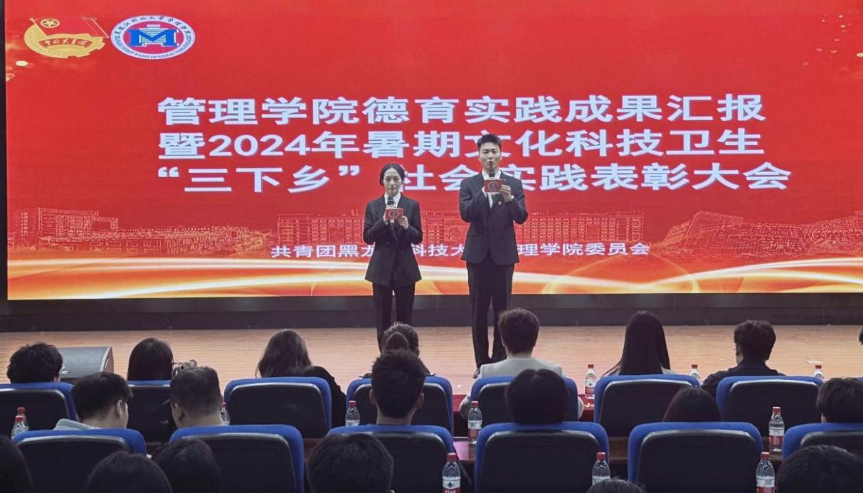 30/ 2024-09管理学院召开德育实践成果汇报暨2024年暑期“三下乡”社会实践表彰大会为深入总结管理学院2024年暑期“三下乡”社会实践工作经验,引导广大青年学生“受教育、长才干、作贡献”,引领学生立志做有理想、敢担当、能吃苦、肯奋斗的新时代好青年,在中国式现代化建设中挺膺担当。学院于9月26日召开以“青春为中国式现代化挺膺担当”为主题的德育实践成果汇报暨2024年暑期“三下乡”社会实践表彰大会。管理学院党委副书记徐海英、学工办全体辅导员老师以及学生代表参加此次大会。表彰大会在雄壮的“光荣啊,中国共青团”的歌声中拉开帷幕。与会人员共同观看了暑期社会实践宣传视频集...