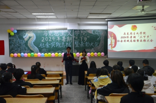 08/ 2024-10马克思主义学院召开2024年暑期“三下乡”社会实践总结暨表彰大会为深入学习贯彻习近平新时代中国特色社会主义思想和党的二十大精神,进一步巩固实践成果,深化活动影响,扩大育人实效。9月27日,马克思主义学院召开2024年暑期“三下乡”社会实践总结暨表彰大会,学院团委书记宋烨、团学骨干、学院学生代表参加会议,各学院团委副书记出席会议。会议在嘹亮的团歌声中拉开序幕。会上,通过观看《马克思主义学院暑期社会实践成果一览》视频,与会成员共同回顾暑期社会实践精彩瞬间。团委书记宋烨宣读暑期“三下乡”社会实践表彰决议。与会老师与团学骨干分别为在爱国主义教育、中...
