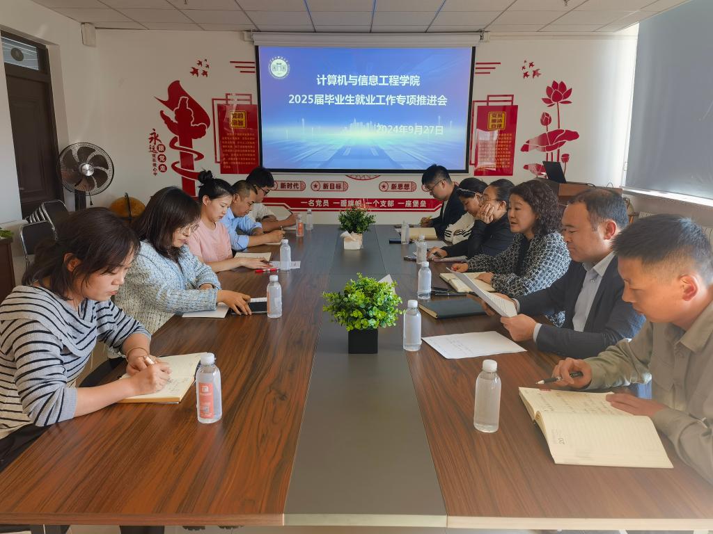 30/ 2024-09计算机学院召开2025届毕业班班主任就业推进会为扎实做好2025届毕业生就业工作,确保阶段性就业工作目标顺利实现,9月27日,计算机学院召开2025届毕业生就业工作推进会暨毕业班班主任就业工作例会,2025届毕业班辅导员以及毕业班班主任参加会议,会议由学院党委副书记张丽媛主持。会上,学院副处级辅导员韩永辉宣读了《计算机与信息工程学院2025届毕业生就业工作方案》,从指导思想、工作举措、目标成效等方面进行了解读;各毕业班班主任详细汇报了所带班级学生就业情况,逐...
