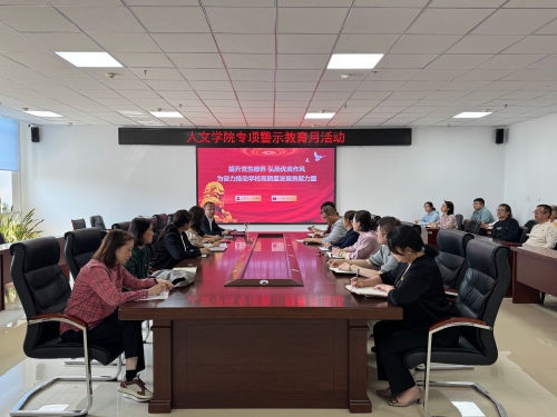 29/ 2025-05人文学院全面启动专项警示教育月活动为深入贯彻落实学校下发《关于开展专项警示教育月活动的通知》要求,一体推进开展深入贯彻中央八项规定精神学习教育、深化干部能力作风建设、师德师风及警示教育等工作,5月26日下午,人文学院在朝阳楼0317会议室组织开展专题学习,党委书记孙晓辉带头讲党课。学院领导班子成员、全体教师党员及教师入党积极分子参加活动。党课上,孙晓辉以《提升党性修养弘扬优良作风为奋力推动学校高质量发展贡献力量》为题,以全面学习贯彻全国全省教育大会精神,落实立德树人根本任务,践行“为党育人为国育才”使命为切入点...