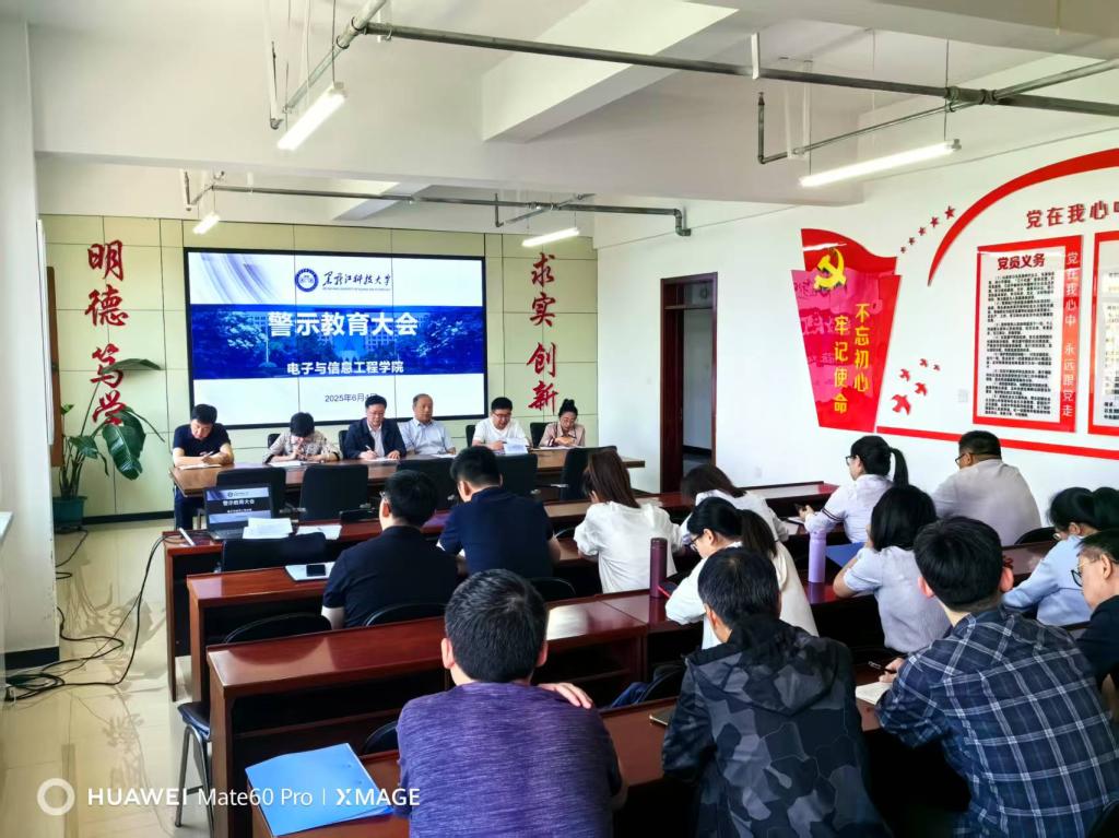 06/ 2025-06电子与信息工程学院召开警示教育大会为扎实开展深入贯彻中央八项规定精神学习教育,落实全省领导干部警示教育会议精神及学校警示教育大会精神,6月4日下午,电子与信息工程学院在朝阳楼0809会议室召开警示教育大会。学院领导班子全体成员、全体教职工参加会议。会议由电信学院党委书记齐秀强主持。会议传达了5月30日学校2025年度警示教育大会精神和学校党委书记周宏力在大会上的讲话精神;会议通报了《关于李献林、叶金广等人违规吃喝严重违反中央八项规定精神问题的通报》和《黑龙江省纪委监委通报5起违规吃喝典型问题》。会议指出,贯彻落...