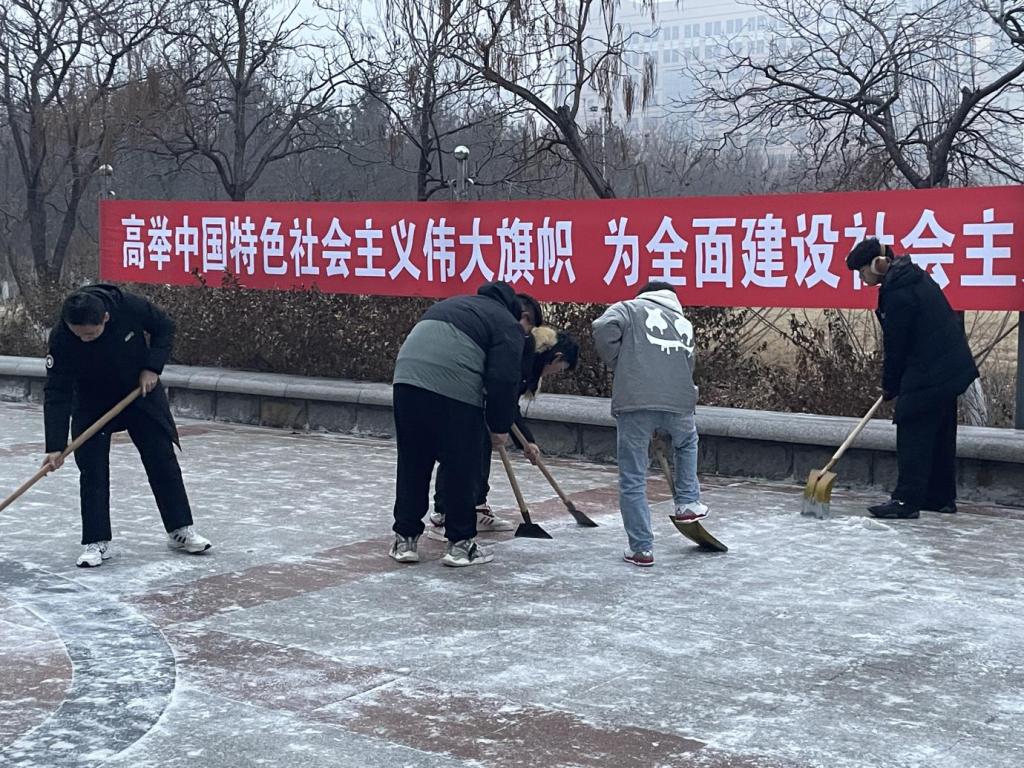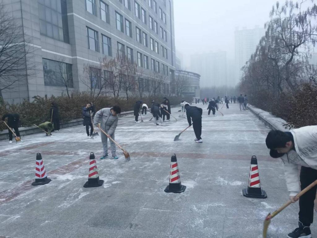 11月24日下午,今年入冬以来的第一场雪纷纷扬扬不期而至。 “以雪为令、雪停路净”,雪停的间隙,各学院学生在辅导员老师的带领下,克服天气寒冷的困难,挥舞着铁锹和扫帚,你铲我扫,掀起了一片热火朝天的劳动场面,迅速把道路上的积雪清扫干净。大学生忙碌的身影构成了一道亮丽的校园风景线。