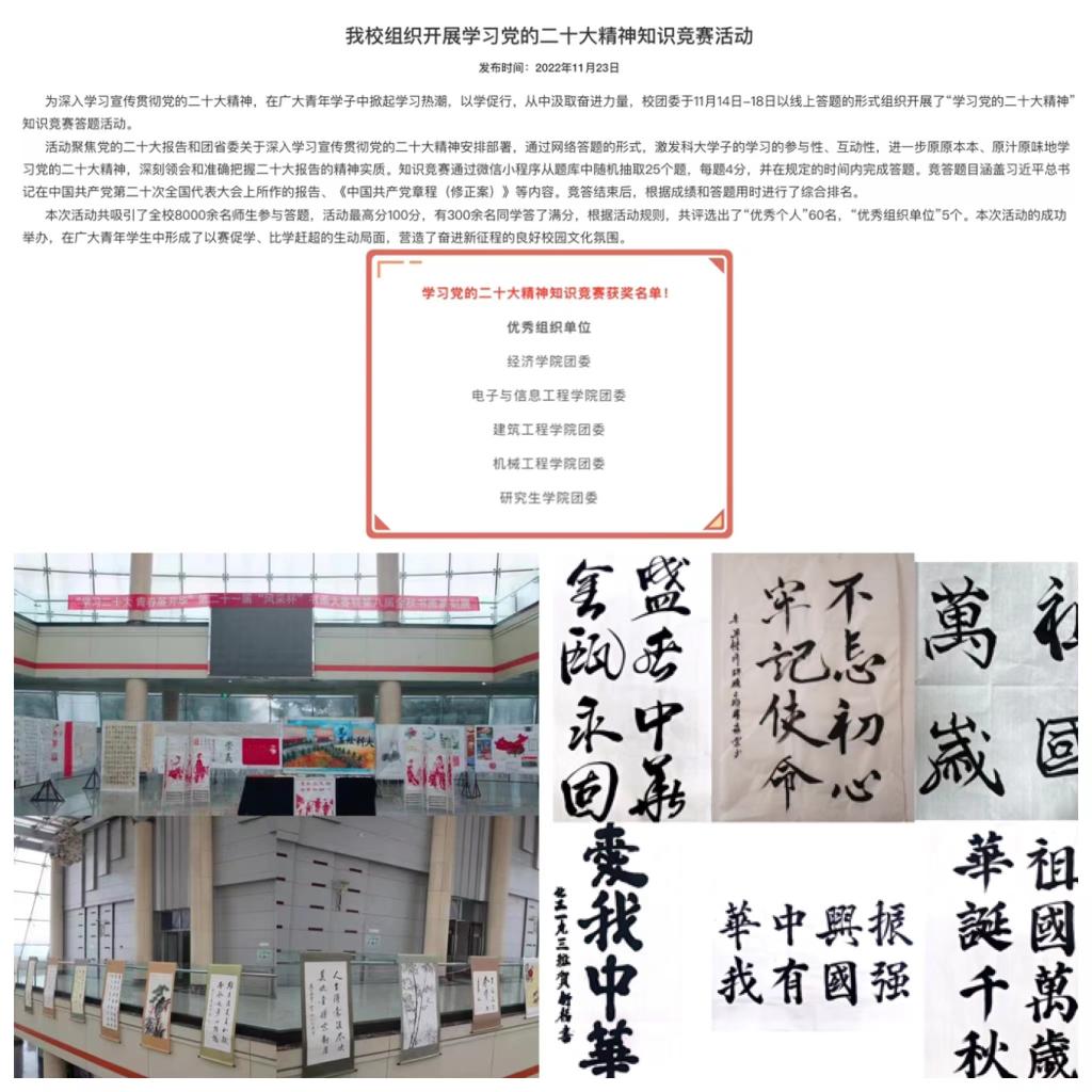 全体专职团干部立足本职,扎实开展“千校万岗·就业有位来”活动,主动完成了与65名毕业生结对帮扶工作;校院两级学生会组织持续开展了“请你观看世界杯”“畅路暖心”等“我为同学做实事”主题实践活动;青年传媒中心组织开展了党的二十大精神网络知识线上答题活动,全校累计参与8000余人;学生社团组织开展了“学习二十大、青春展芳华”第二十一届“风采杯”书画大赛暨第八届金秋书画篆刻展、第二十五届“贵玉杯”青春诗会、第十九届“收获金秋”科技创新节等系列活动;各学院分团委精心设计并组织开展了“电掣青春”校园跑、“强国一代有我在”主题征文等主题校园文化活动40余个。各级团学组织将党的二十大精神有机融入到书画展览、青春诗会、主题演讲、创新设计大赛等系列活动中,营造了浓郁的校园学习氛围,展现了米兰(中国)一站式服务平台青年学生朝气蓬勃、健康向上的青春风采。