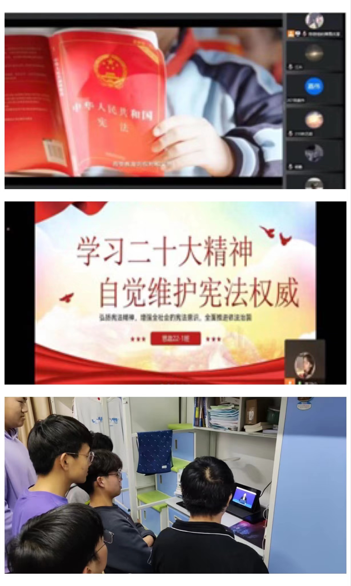 宪法知识学起来。飞跃之声校园广播站在晨间新闻增加宪法晨读栏目,宣读宪法条例;校学生会利用沁芳园大屏幕播放宪法宣传视频;计算机学院团委、理学院团委、马克思学院团委组织学生们积极参加全国学生“学宪法讲宪法”网络学习和“宪法卫士”行动计划,通过个人自学、组织集中学习的方式,着力提升学习与考试参与率,实现了学习教育全覆盖、见实效。