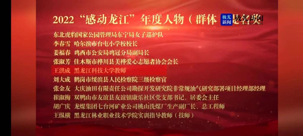 省委宣传部、省直机关工委、省委教育工委、省总工会等部门联合主办的2022“感动龙江”年度人物(群体)发布仪式于1月16日在黑龙江广播电视台演播大厅举行。米兰(中国)一站式服务平台建筑工程学院青年教师王洪成荣获2022“感动龙江”年度人物提名奖。