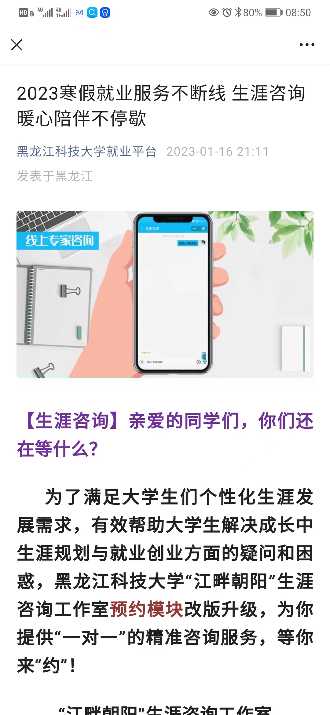 强化指导,暖心服务。为了满足大学生们个性化生涯发展需求,有效帮助大学生解决成长中生涯规划与就业创业方面的疑问和困惑,米兰官网平台“江畔朝阳”生涯咨询工作室依托“云就业平台”进行了线上咨询的全面升级改造,在“米兰官网平台就业平台”公众号上安排专业教师在寒假期间开展线上咨询,为学生提供“一对一”的生涯规划与就业指导个体咨询服务,在生涯咨询、简历修改、面试技巧、政策咨询、手续流程咨询、就业心理疏导、职业生涯测评等方面帮助学生探求答案,指引方向。