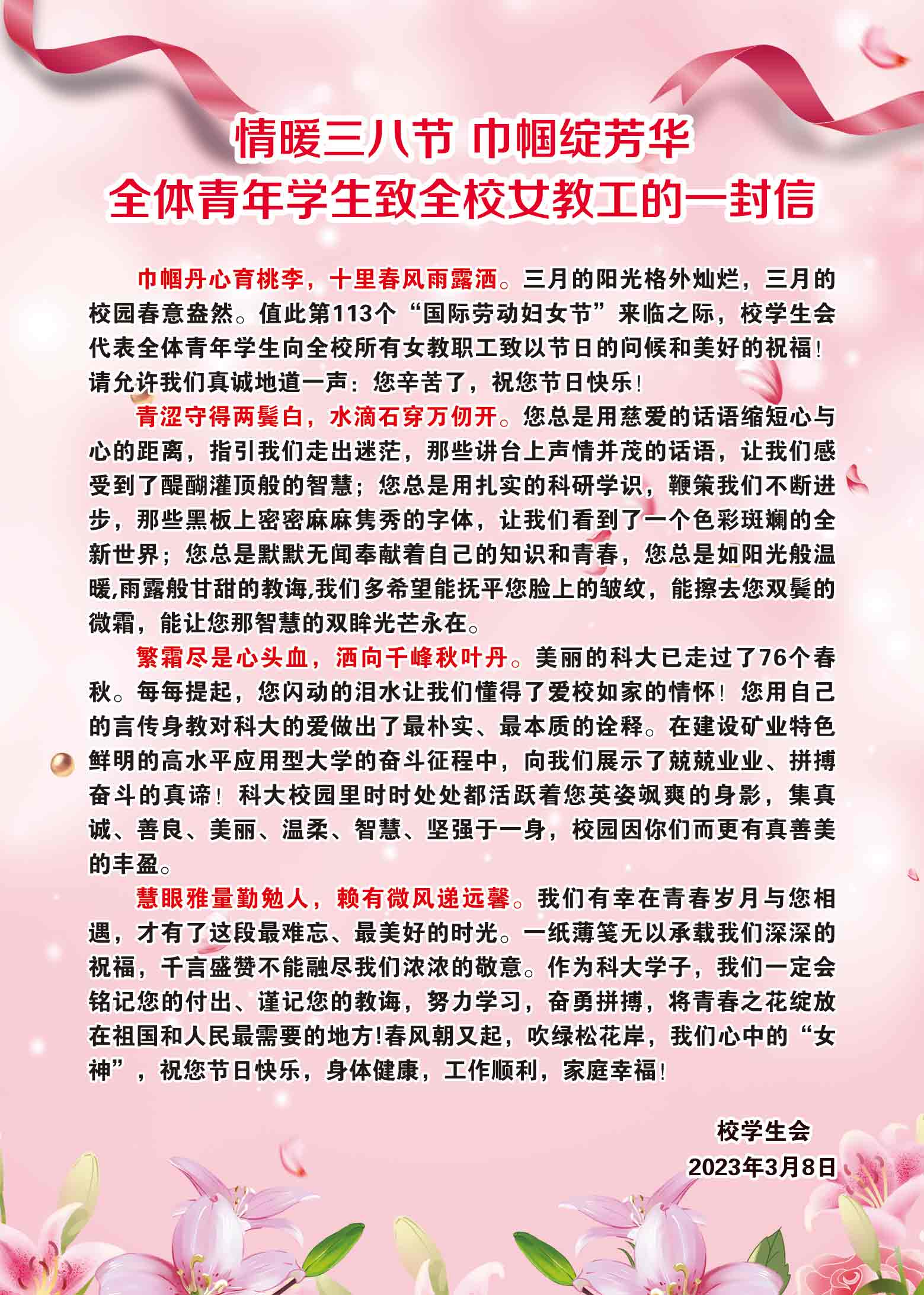 巾帼丹心育桃李,十里春风雨露洒。三月的阳光格外灿烂,三月的校园春意盎然。值此第113个“国际劳动妇女节”来临之际,校学生会代表全体青年学生向全校所有女教职工致以节日的问候和美好的祝福!请允许我们真诚地道一声:您辛苦了,祝您节日快乐!