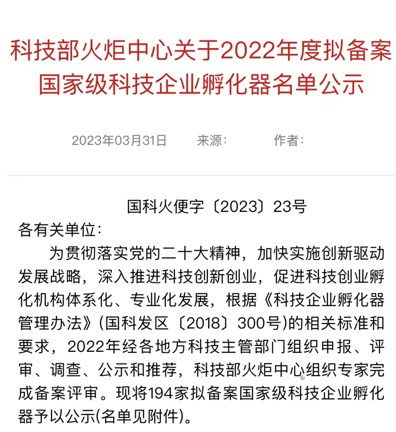 国家级科技企业孵化器认定工作于2022年9月开始启动,学校科技园作为申报主体,积极准备孵化器申报相关材料,得到了学校党政领导的高度重视,相关领导多次召开会议部署落实。在申报过程中得到了学校各个部门的大力支持,经过市科技局、省科技厅审核确认,最终成功推荐到国家科技部火炬中心认定成功。创新创业中心将以国家级科技企业孵化器成功认定为契机,强化科技园内涵发展建设,以高质量发展为目标,为成功创建国家级大学科技园奠定坚实基础。