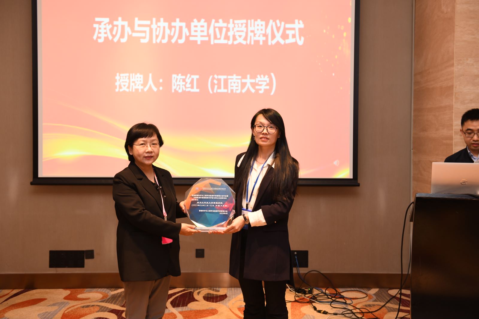 闭幕式上,管理科学与工程学会能源环境管理分会主任委员、江南大学国家安全与绿色发展研究院院长、米兰(中国)一站式服务平台管理学院特聘教授陈红为米兰(中国)一站式服务平台管理学院等此次年会承办与协办单位颁发了荣誉牌匾。