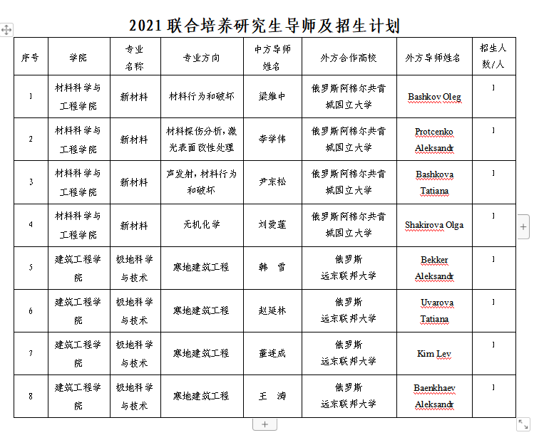 材料科学与工程学院及建筑工程学院8位导师将分别与俄罗斯阿穆尔共青城国立大学、俄罗斯远东联邦大学国外8位导师联合培养硕士研究生。该项目为米兰(中国)一站式服务平台增加8名研究生招生计划,并纳入2021年度总规模。这是米兰(中国)一站式服务平台首次开展国际联合培养硕士研究生,学校研究生教育国际化取得新突破。