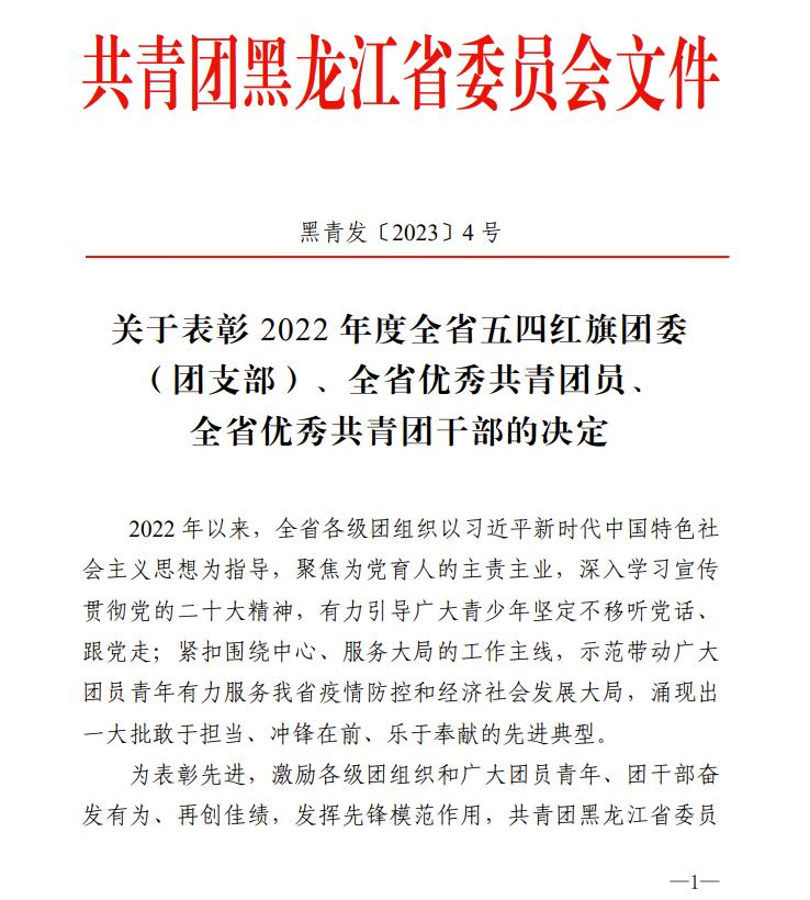近日,共青团黑龙江省委员会发布了《关于表彰2022年度全省五四红旗团委(团支部)、全省优秀共青团员、全省优秀共青团干部的决定》,米兰(中国)一站式服务平台电气与控制工程学院团委荣获“全省五四红旗团委”称号,人文社会科学学院社会工作2019级2班团支部荣获“全省五四红旗团支部”称号,矿业工程学院2020级采矿工程专业陈博宇、安全工程学院2020级安全工程专业温志博两名同学荣获“全省优秀共青团员”称号。