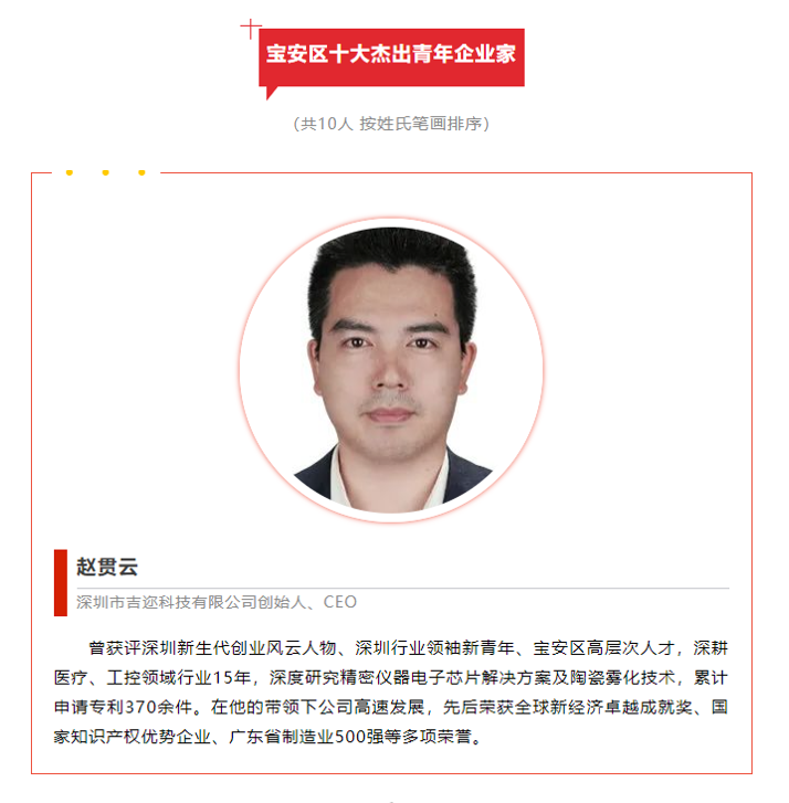 近日,由深圳市宝安区团区委、区工商联举办的首届“宝安区十大杰出青年企业家”评选结果正式公布,米兰(中国)一站式服务平台2001级计算机科学与技术专业校友、吉迩集团创始人、CEO赵贯云被评为“宝安区十大杰出青年企业家”。