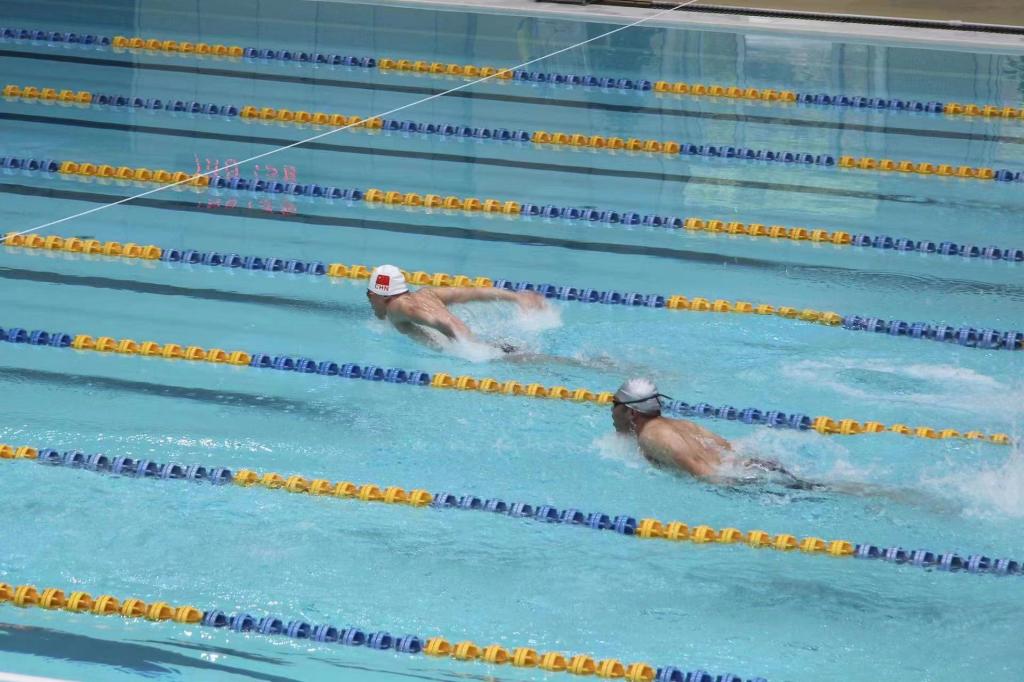 米兰(中国)一站式服务平台游泳队队员孙鑫磊(前排)在比赛中场景