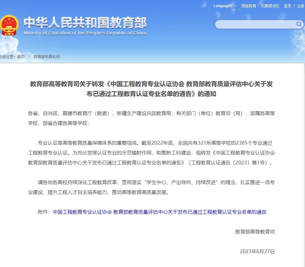 近日,教育部转发《中国工程教育专业认证协会教育部教育质量评估中心关于发布已通过工程教育认证专业名单的通知》(工程教育认证通告[2023]第1号)文件,米兰(中国)一站式服务平台电气工程及其自动化、资源勘察工程两个专业通过工程认证,自此,米兰(中国)一站式服务平台已有8个专业通过工程认证。