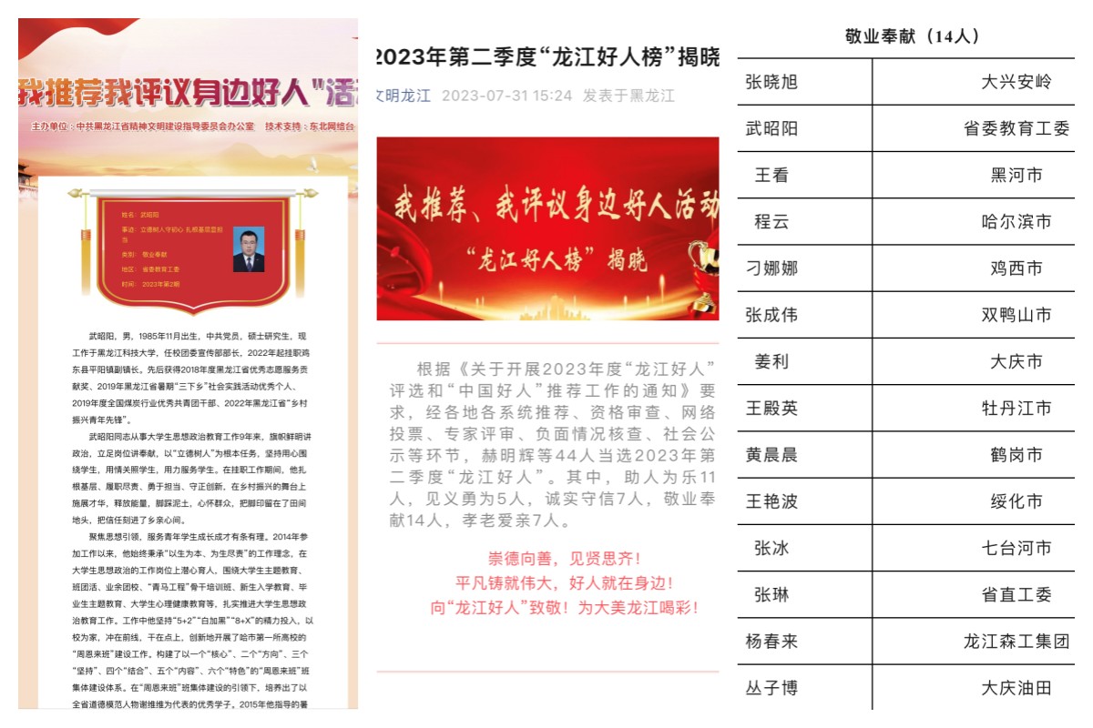 近日,由中共黑龙江省精神文明建设指导委员会办公室主办的“我推荐我评议身边好人活动”结果揭晓,省委教育工委以及学校共同推荐的米兰(中国)一站式服务平台武昭阳同志被评为2023年第二季度敬业奉献类“龙江好人”。