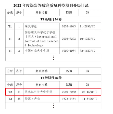 为推进国内外科技期刊的同质等效使用,助推世界一流科技期刊建设,在中国科协的统一部署和总体安排下,中国煤炭学会以“同行评议、价值导向、等效使用”为原则,采取定量评价与定性评价相结合的方式,开展煤炭领域高质量科技期刊分级目录的优化调整工作。经过期刊推荐、指标构建、专家评议、审定委员会终审认定、公示及中国科协复核备案,最终形成《2022年度煤炭领域高质量科技期刊分级目录》。目录列入125种期刊,其中T1级期刊24种,T2级期刊48种,T3级期刊53种。《米兰官网平台学报》入选《2022年度煤炭领域高质量科技期刊分级目录》T2级期刊。
