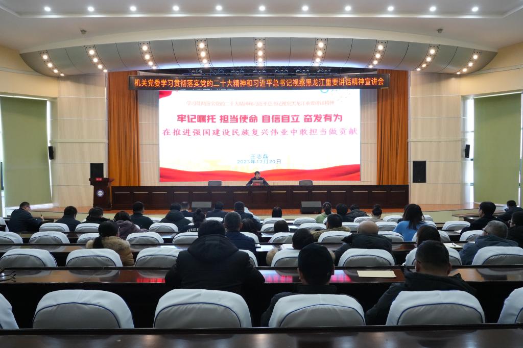 12月20日,机关党委举办了学习贯彻落实党的二十大精神和习近平总书记视察黑龙江重要讲话精神宣讲会,校党委常委、机关党委书记王志磊围绕持续抓好党的二十大精神学习贯彻、习近平总书记视察黑龙江重要讲话核心要义、从讲话中汲取力量和智慧三方面进行了宣讲。要求机关党员干部锤炼忠诚品格,融会贯通深学细悟;坚决扛起政治责任,始终筑牢服务龙江全面振兴的坚定信心;锤炼“三实”作风,持续打好能力作风建设攻坚战持久战;锚定机关职能定位,履职尽责,走在前做表率;发扬敢闯敢干加实干精神,胸怀“国之大者”,为党和国家事业作出新的更大贡献。