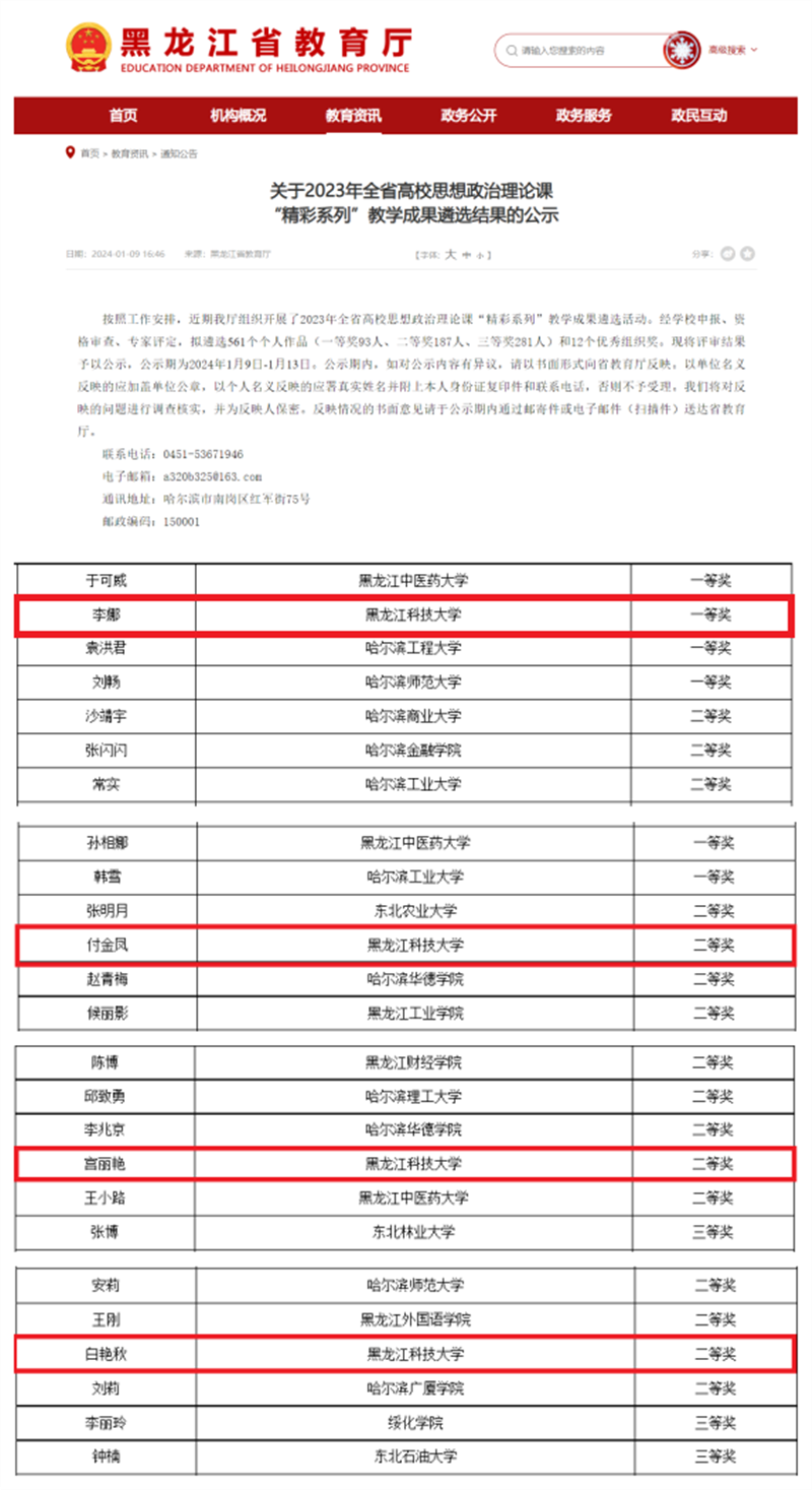 1月9日,由黑龙江省教育厅主办的2023年全省高校思想政治理论课“精彩系列”教学成果遴选活动结果正式公布,米兰(中国)一站式服务平台马克思主义学院教师共荣获一等奖2项,二等奖7项,三等奖5项,其中“精彩教案”获奖5人,“精彩课件”获奖3人,“精彩微课”获奖4人,精彩实践获奖2人,实现了全部4个赛道获奖全覆盖,同时学校荣获优秀组织奖。