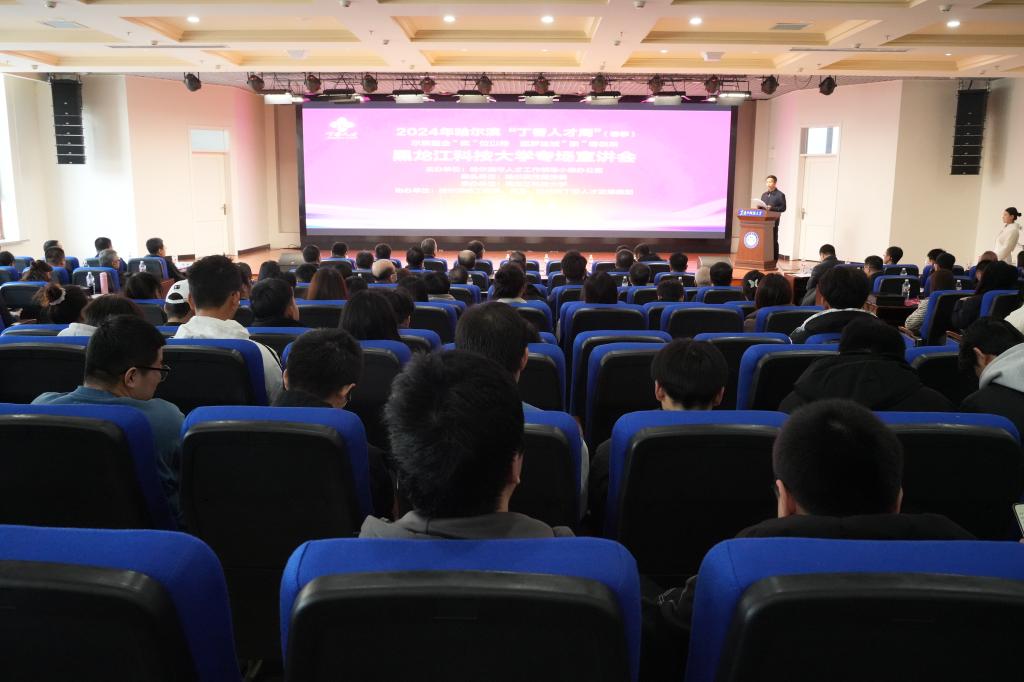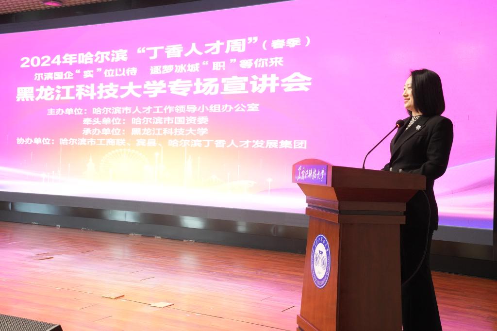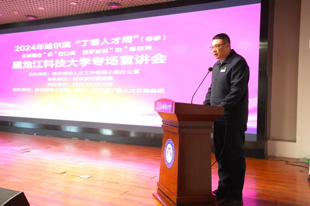 在招聘专场宣讲会上,桑玉军代表学校致欢迎辞。许庄就留哈人才政策、龙江经济发展优势等方面进行城市推介。马迭尔文旅集团人力资源管理中心主任赵洪英、哈尔滨空调股份有限公司副总经理杨峰作为企业代表进行企业推介。宣讲会由校党委常委、组织部部长王志磊主持。