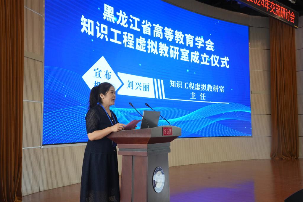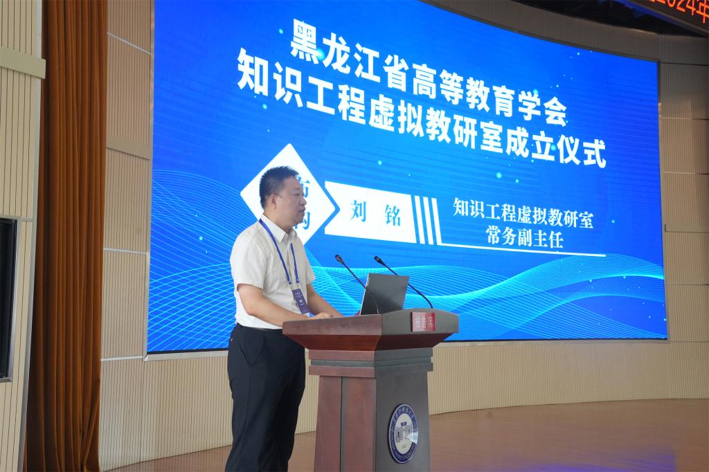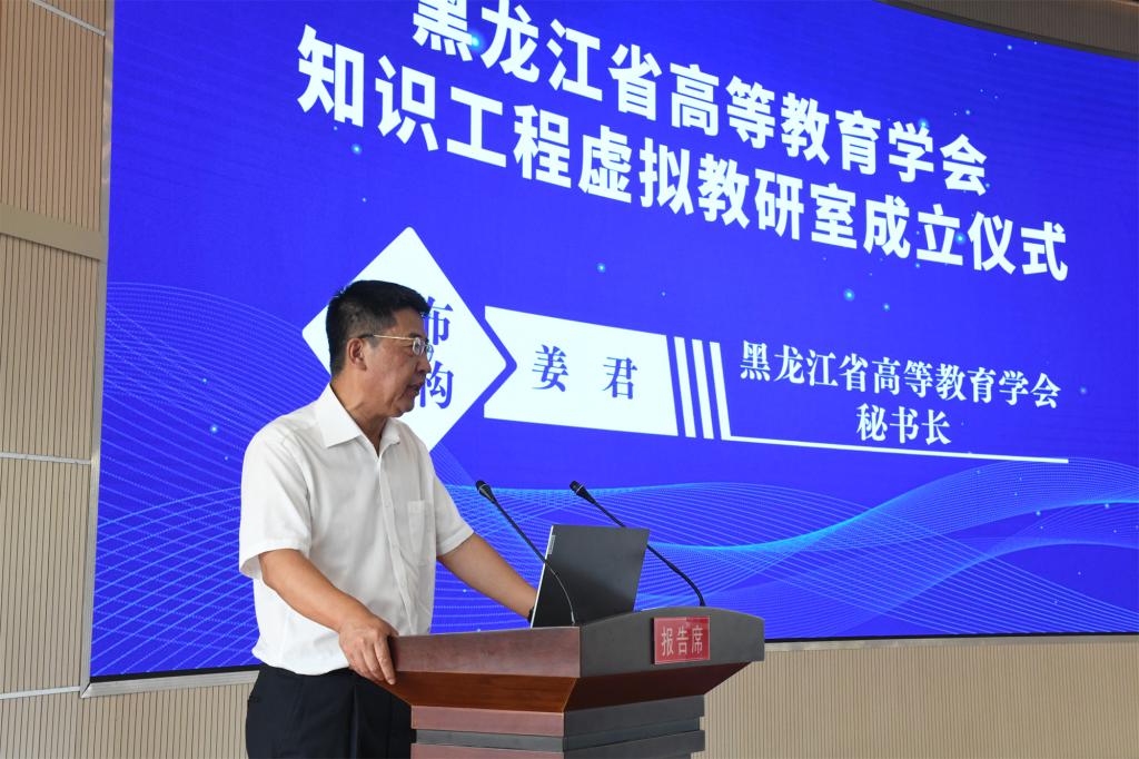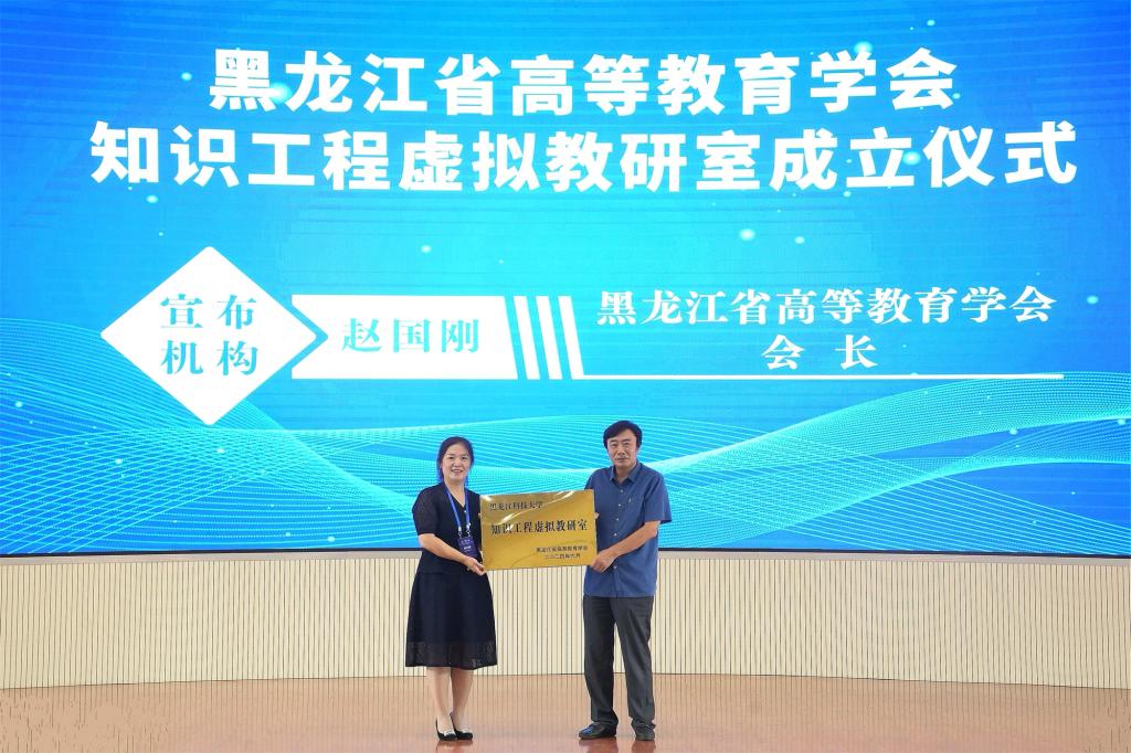 嘉宾致辞后,举行黑龙江省高等教育学会知识工程虚拟教研室成立仪式。黑龙江省高等教育学会秘书长姜君主持成立仪式、宣读了关于成立知识工程虚拟教研室的决定,黑龙江省高等教育学会会长赵国刚为虚拟教研室授牌,虚拟教研室主任刘兴丽作了表态发言,虚拟教研室常务副主任刘铭宣读了虚拟教研室组织架构。