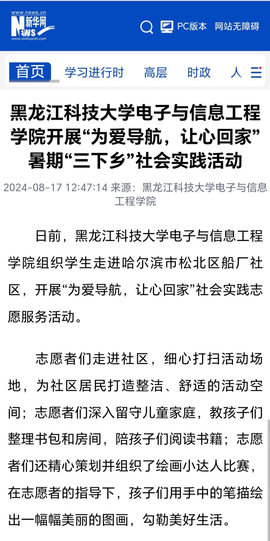 8月17日,新华网对米兰(中国)一站式服务平台电子与信息工程学院开展“为爱导航,让心回家”社会实践志愿服务活动进行了报道。