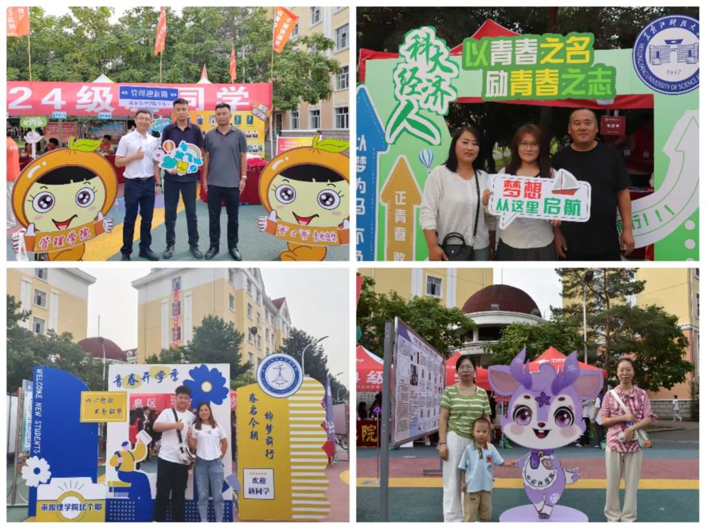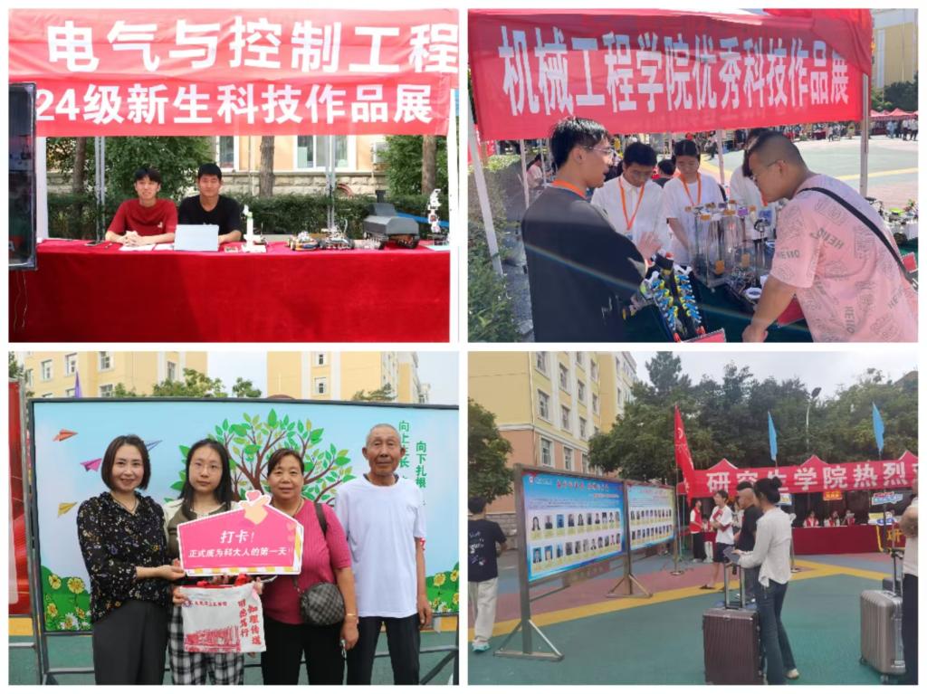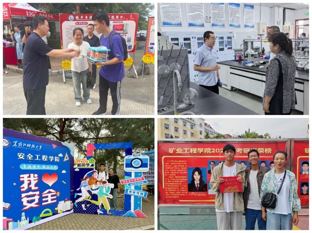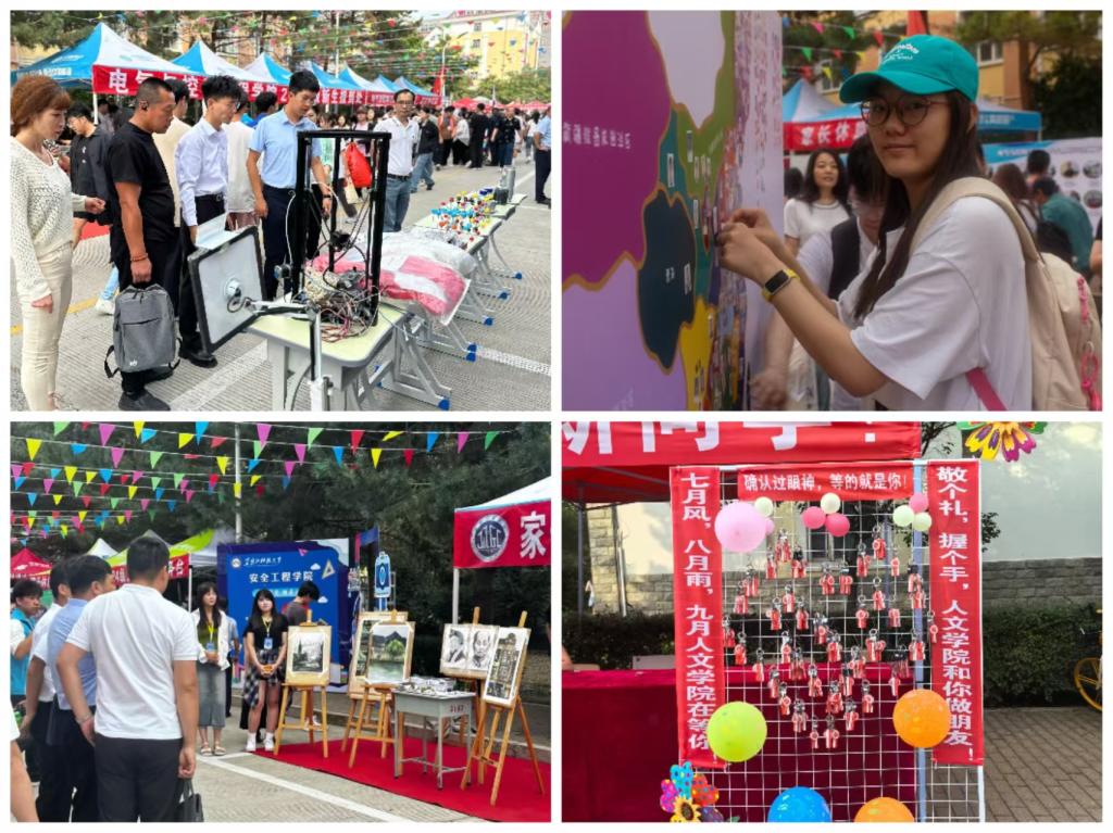 百花齐放,特色迎新亮点惊喜不断。各学院精心布置迎新现场,展示专业特色,让新生们对未来的学习生活充满信心。矿业学院设置2024届考研光荣榜吸引众多家长和新生驻足观看,祝愿新生们四年后荣登此榜;环化学院开展“家长走进实验室”活动,专业老师对家长关心的专业及行业相关问题给予耐心细致的解答;安全学院为新生准备了带有“松花四季”手绘图的校园一卡通卡套,既有纪念意义又能让新生感受到便捷和贴心;电气学院、机械学院设置大学生“科技作品特色”展台,展示学生参赛获奖作品,营造浓厚的科技创新氛围;电信学院为报到当日过生日的同学准备生日礼物,让新生感受到真挚与温暖;材料学院将石墨烯领域的各类特色产品陈列于迎新现场并配有讲解工作人员,激发新生对专业知识得学习兴趣;建工学院布置了《陈郁》、《矿工》素描画像、建筑水彩画以及道桥模型,展示学院的学风建设成果与文化底蕴;计算机学院在中国地图展板上贴满了新生的头像,明确自己在祖国的位置,增强新生民族自豪感;管理学院、经济学院、理学院、外语学院精心布置学院吉祥物、迎新打卡点、签名墙和指航路标,营造满满的仪式感和氛围感;人文学院在报到台处设置印有学院徽章和“我在人文学院等你”字样的钥匙扣领取处,营造了温馨的迎新氛围;马克思学院精心设计入学“成长树”,新生粘贴写有自己姓名的树叶,寓意在学院厚土滋养下向上生长、向下扎根;研究生学院设置毕业生风采及就业典型代表展板,发挥榜样引领作用,激发新生的学习热情和创新精神。