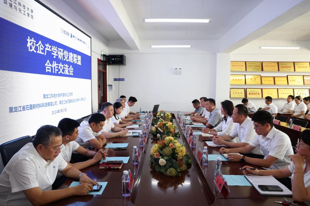 交流会上,苗雨代表环境与化工学院对龙江交通、石墨科技公司各位领导、专家的来访表示欢迎。她简要介绍了学校的办学历史和学院总体情况,并表示两家单位在煤炭产业链和石墨产业链上的合作契合度很高,可以以此次产学研党建联盟搭建为契机,双方单位党建赋能聚合力,按照“党建引领、校企合作、产教融合、协同育人、共同发展”的原则,资源共享、优势互补、注重实效、共同发展,以“碳谷生态圈”建设为契机,围绕龙江“4567”现代产业体系,发展石墨新质生产力,积极推动人才互培和科技成果转化落地,提高共建水平。