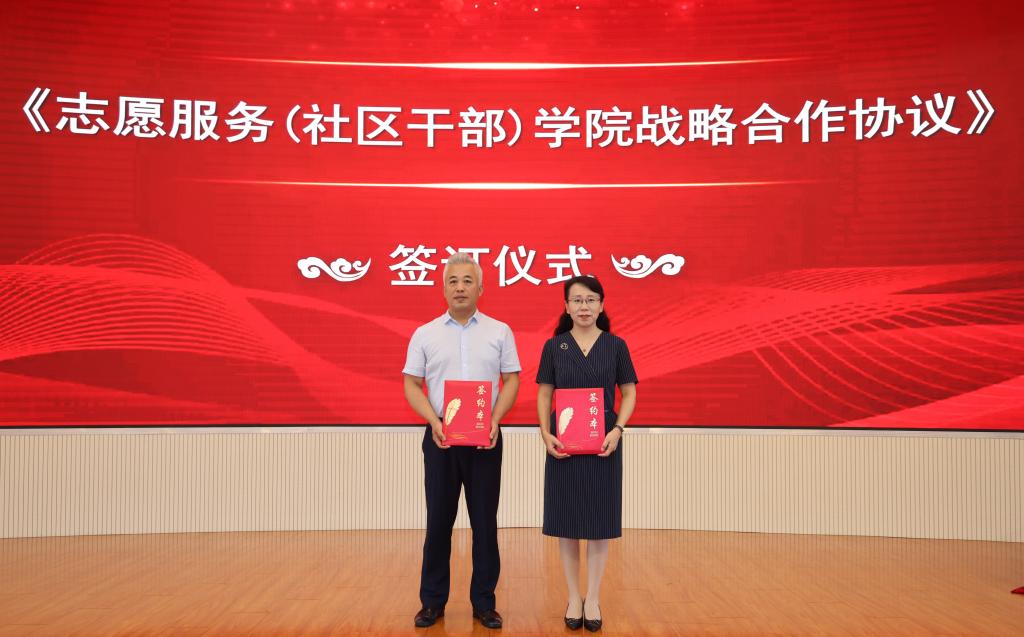 松北区委社会工作部部长鲍士杰与教务处处长宋志伟共同签订了 “志愿服务(社区干部)学院战略合作协议”,旨在传播志愿精神、提升社区服务能力、搭建政校合作新平台。
