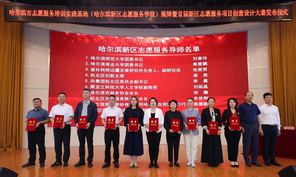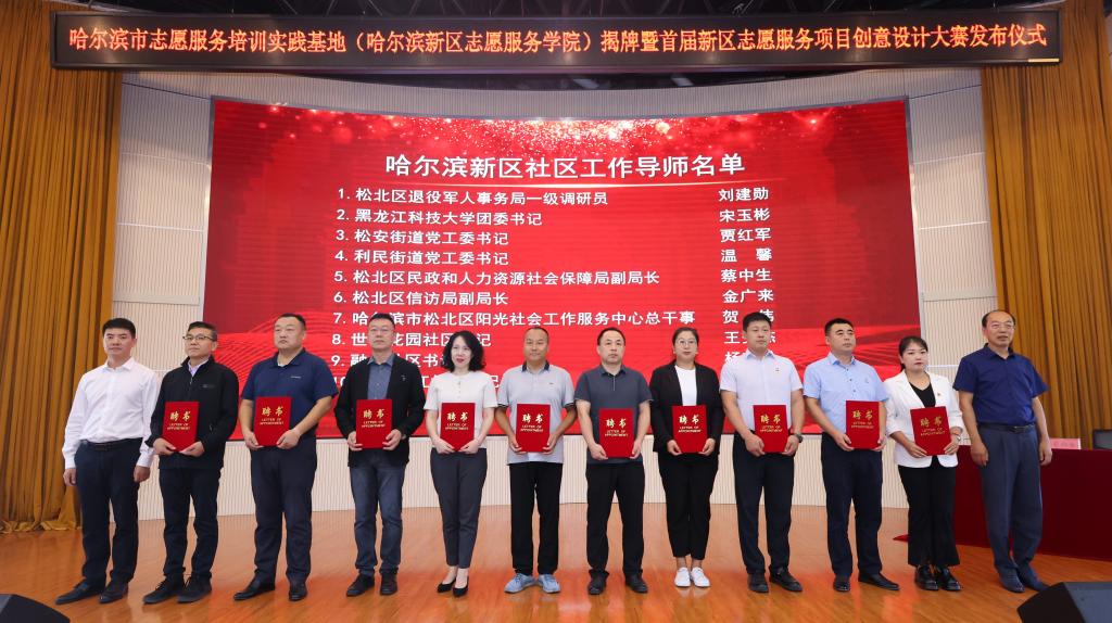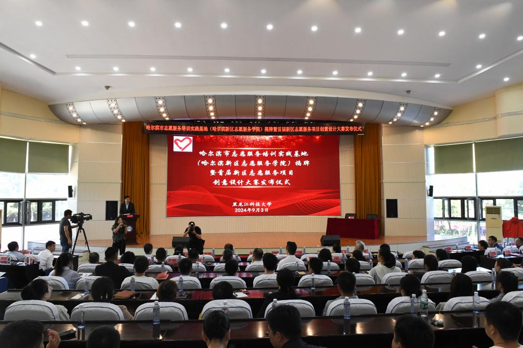 在深入学习贯彻党的二十届三中全会及省委十三届六次全会精神之际,为构建多主体政校产学合作共同体,推进“新文科”建设背景下的产业学院建设,9月3日上午,哈尔滨市志愿服务培训实践基地(哈尔滨新区志愿服务学院)揭牌暨首届新区志愿服务项目创意设计大赛发布仪式在米兰(中国)一站式服务平台举行。省、市、区委社会工作部领导、部分校领导、新区各高校教育同仁、九区九县社会工作部部长,新区各街道、社区、企事业单位志愿服务队负责人和优秀志愿者代表,学校教务处、校团委和人文学院师生等共计260余人参加会议,会议由副校长张保勇主持。
