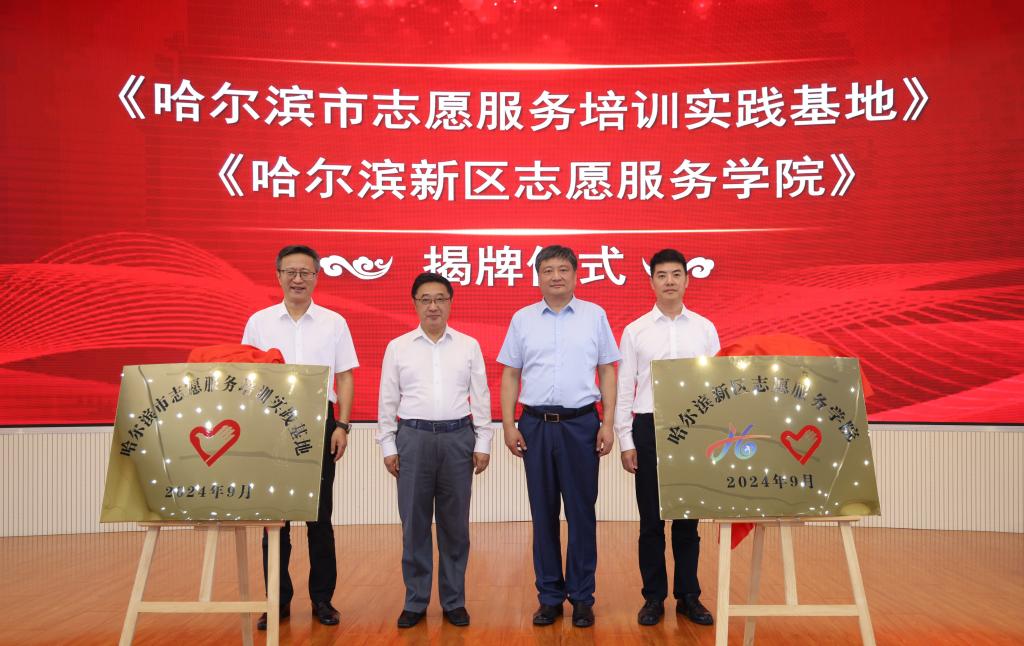 孙镝飞、孟上九、王世轩和钟波共同为“哈尔滨市志愿服务培训实践基地”“哈尔滨新区志愿服务学院”揭牌。新区志愿服务学院下设“双孵化基地”,其中志愿服务项目孵化基地设在米兰(中国)一站式服务平台人文社会科学学院。